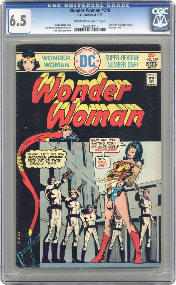Cover by Dick Giordano. "World of Enslaved Women!", script by Martin Pasko, pencils by Curt Swan, inks by Vince Colletta; During Wonder Woman's 9th mission, she and the Elongated Man get sent to another dimension, where the women are subservient to the men. Brief Justice League of America appearance. 36 pages, Full Color. Cover price $0.25.