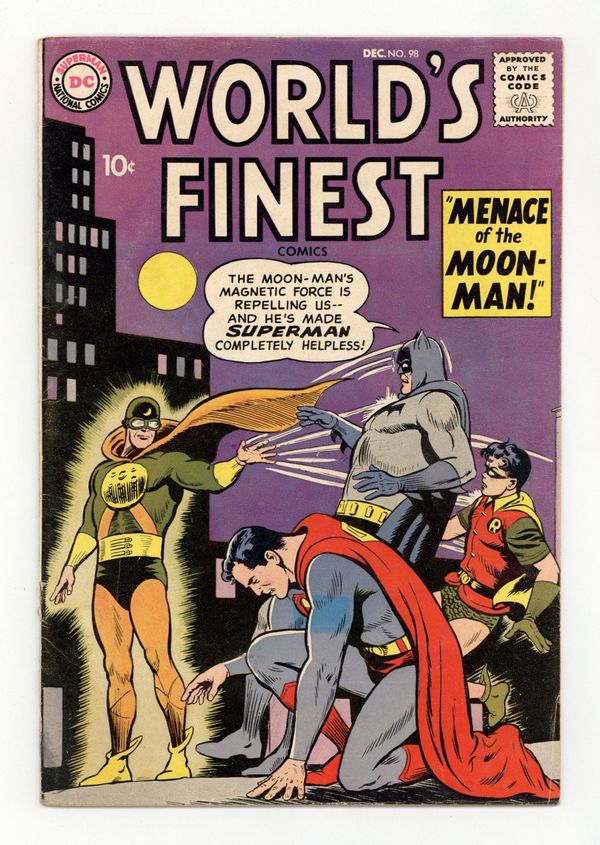 Starts Jan 26 Cover pencils by Curt Swan, inks by Ray Burnley. The Menace of the Moonman starring Superman and Batman, script by Bill Finger, pencils by Dick Sprang, inks by Stan Kaye; While orbiting the moon, a strange comet crosses paths with Pilot Rogers rocket; When he returns to Earth he discovers that whenever moonlight strikes him he becomes the evil MoonMan. House ad for Blackhawk #131. Dexter humor two-pager by Henry Boltinoff. The Strange Hero of Fort Mascot starring Tomahawk, art by Fred Ray. Sharing- The United Nations Way public service announcement, script by Jack Schiff, art by George Roussos. The Unmasked Archers! starring Green Arrow, script by Ed Herron, pencils by Jack Kirby, inks by Jack Kirby and Roz Kirby; Green Arrow and Speedy's secret IDs are almost revealed in a practical joke. 36 Pages, Full Color. Cover price $0.10.