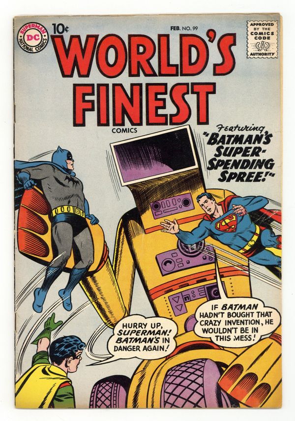 Cover pencils by Curt Swan, inks by Stan Kaye. Batman's Super Spending Spree, script by Bill Finger, pencils by Dick Sprang, inks by Stan Kaye; Batman announces he is going to spend a million dollars; When his purchases turn out to be busts, Superman secretly makes them profitable, against Batman's wishes. Lem 'n' Lime humor two-pager by Henry Boltinoff. Crime Under Glass starring Green Arrow, script by Robert Bernstein, pencils by Jack Kirby, inks by Jack Kirby and Roz Kirby; Green Arrow and Speedy take down a gang of robbers using lenses in their crimes. The Frontier Rogues Gallery starring Tomahawk, art by Fred Ray. Odd News Items, script by Julius Schwartz, pencils by Morris Waldinger, inks by Tommy Nicolosi; before 1870, newspapers were not equipped with folding devices. 36 Pages, Full Color. Cover price $0.10.