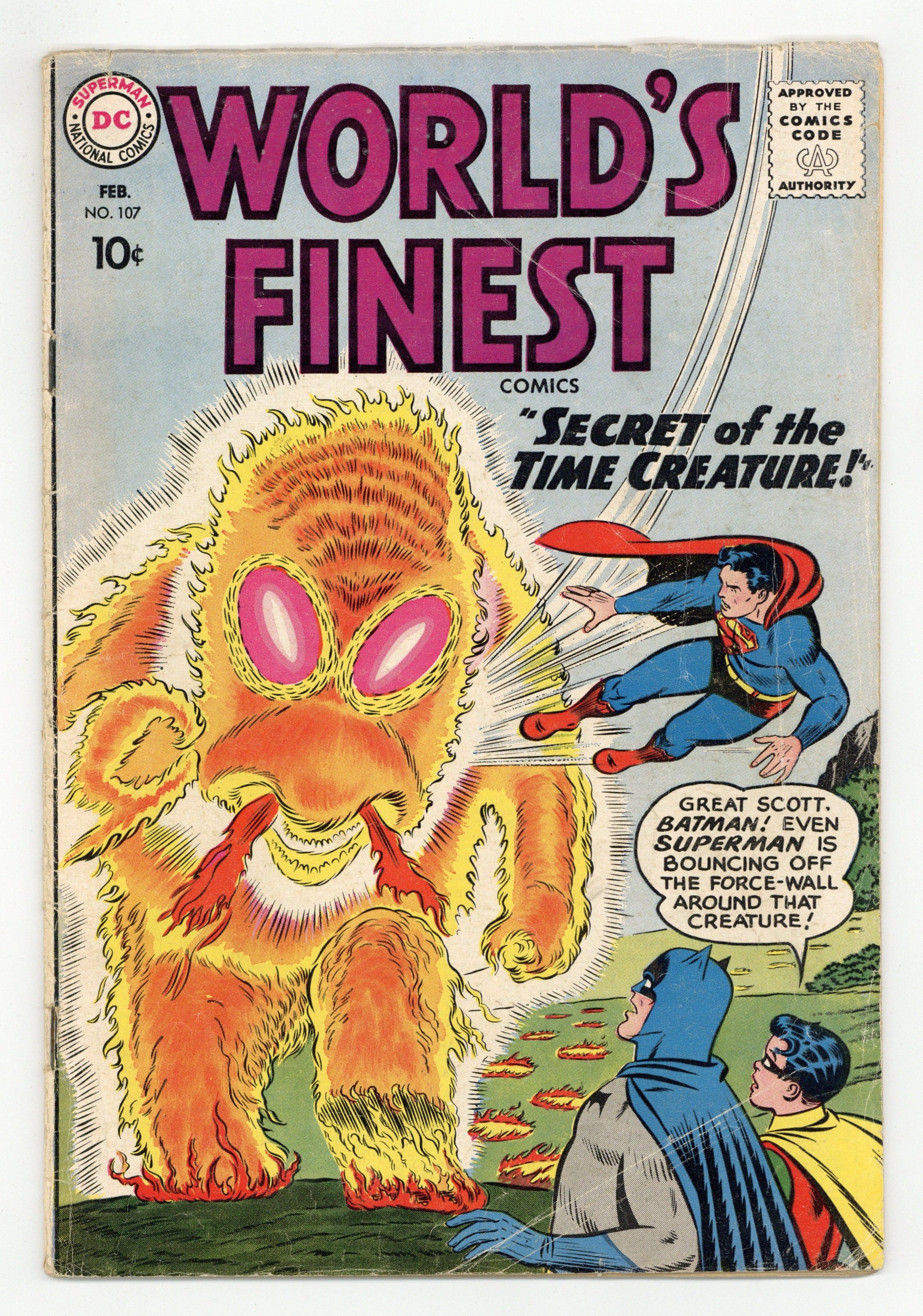 Cover pencils by Curt Swan, inks by Stan Kaye. Secret of the Time Creature starring Superman and Batman, script by Bill Finger, pencils by Dick Sprang, inks by Sheldon Moldoff; While Superman battles a flaming monster in the present, Batman and Robin, courtesy of Prof. Nichols time machine, venture to the past to find an alien device left as a defense against the creature. Batman #129 ad. Shorty humor page by Henry Boltinoff. It's Fun to Help Others! public service announcement starring Superboy, script by Jack Schiff, pencils by Curt Swan, inks by Stan Kaye. The Planeteer Film Star starring Tommy Tomorrow, script by Jack Miller, art by Jim Mooney; Tommy and Brent attempt to duplicate some of their space adventures for the sake of the movie camera. Playful Pop humor page by Phil Berube. The Menace of the Mole Men starring Green Arrow, script by Ed Herron, art by Lee Elias. Detective Comics #275 ad. 36 Pages, Full Color. Cover price $0.10.