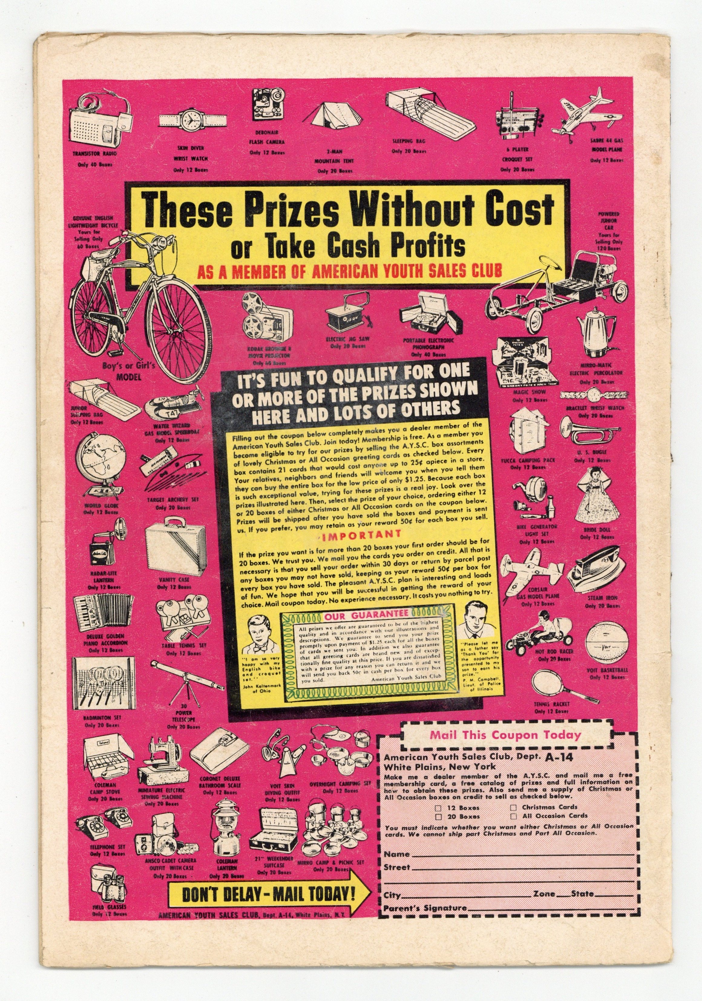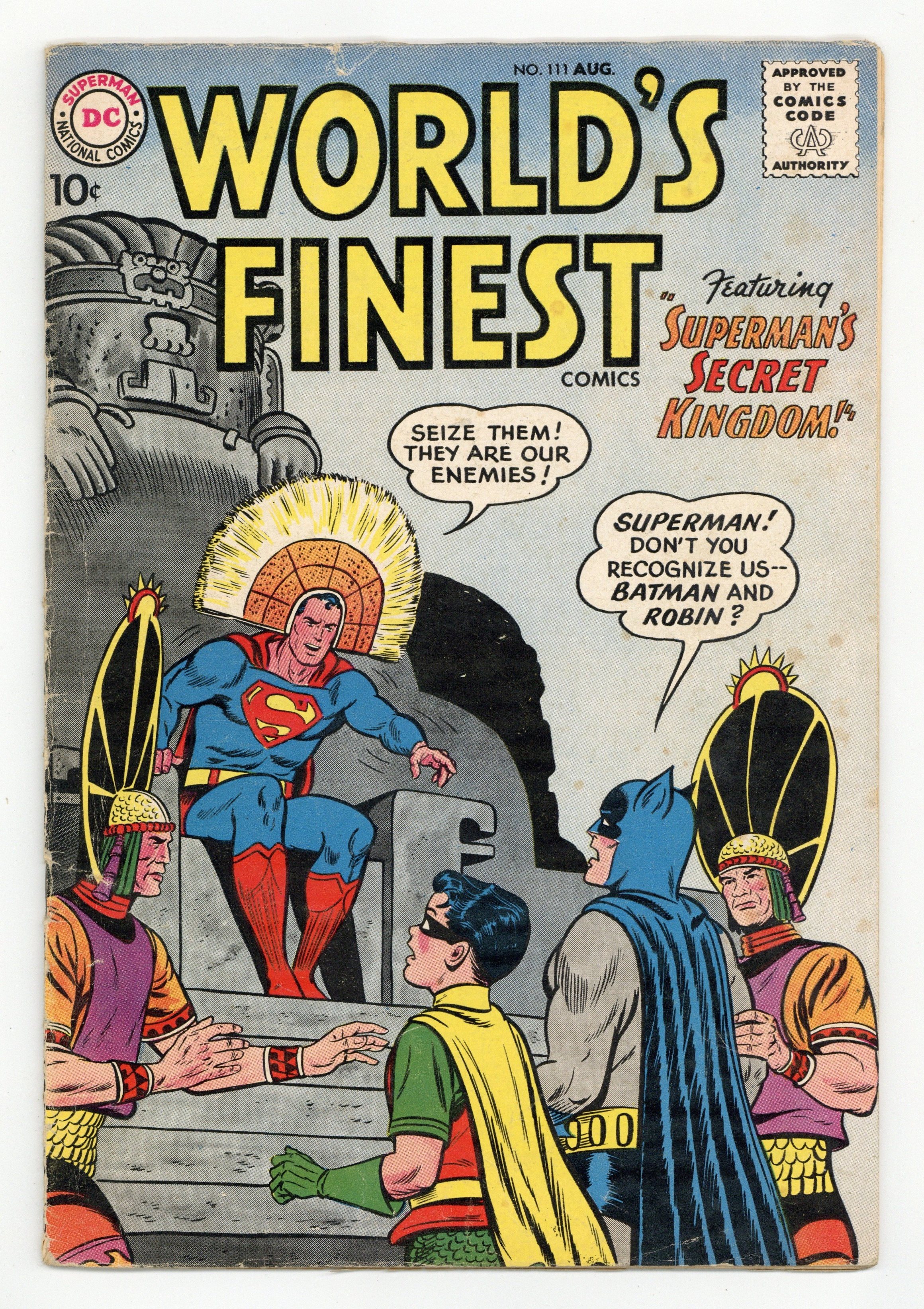 Cover pencils by Curt Swan, inks by Sheldon Moldoff. Superman's Secret Kingdom starring Superman and Batman, script by Bill Finger, pencils by Dick Sprang, inks by Sheldon Moldoff; The force of a volcanic eruption gives Superman amnesia. He finds himself in a forgotten Aztec city and becomes the king of the inhabitants; When Batman and Robin go in search of him, they find the criminal Floyd Frisby who tries to convince Superman that Batman and Robin are really criminals. Ollie humor page by Henry Boltinoff. The Hermit of Titan starring Tommy Tomorrow, script by Jack Miller, art by Jim Mooney. Lend A Friendly Hand public service announcement starring Superman, script by Jack Schiff, pencils by Curt Swan, inks by Sheldon Moldoff. The Crimes of the Clock King starring Green Arrow, script by Ed Herron, art by Lee Elias; The Clock King is successful in a series of crimes, besting Green Arrow and Speedy. 36 Pages, Full Color. Cover price $0.10.