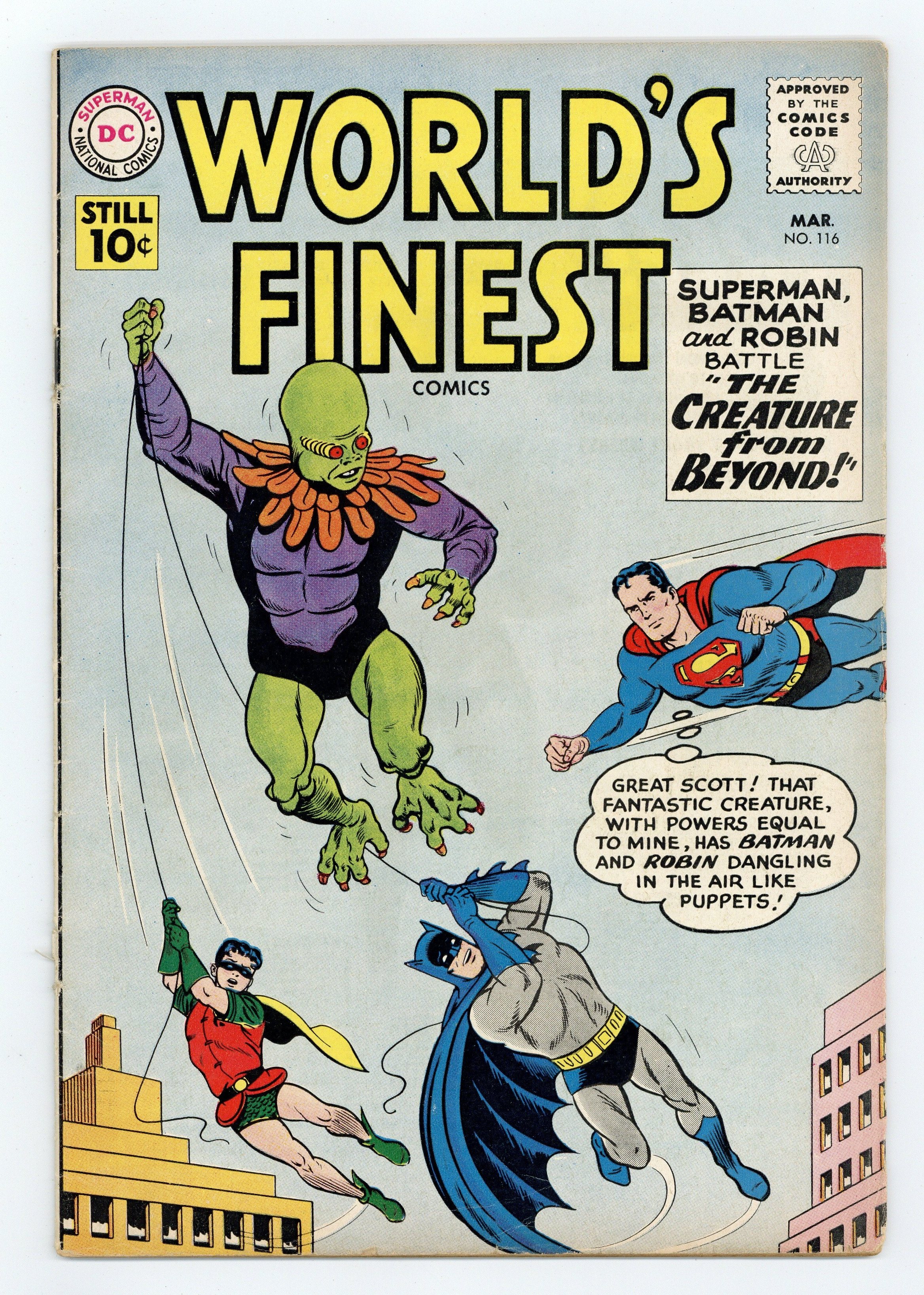 Cover pencils by Curt Swan. The Creature From Beyond! starring Superman and Batman, script by Jerry Coleman, pencils by Curt Swan, inks by Stan Kaye; The Creature from Beyond is helping the Jackson Mob commit robberies. Don' t Sell Nature Short public service announcement, script by Jack Schiff, art by Bernard Baily. Dateline: Outer Space starring Tommy Tomorrow, script by Jack Miller, art by Jim Mooney. Lem n' Lime humor page by Henry Boltinoff. The Ape Archer, script by Ed Herron, art by Lee Elias; Green Arrow and Speedy must determine what has mad the chimp Bonzo take up a life of crime. 36 Pages, Full Color. Cover price $0.10.