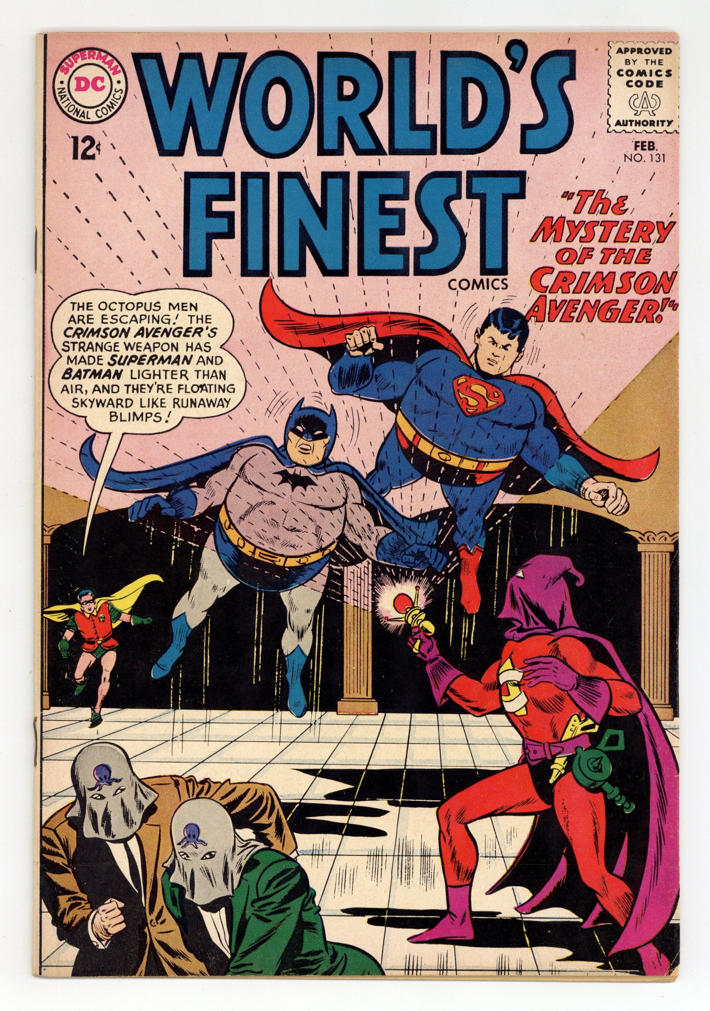 Cover pencils by Dick Dillin, inks by Sheldon Moldoff. The Mystery of the Crimson Avenger starring Superman and Batman, script by Bill Finger, pencils by Dick Sprang, inks by Sheldon Moldoff; The Crimson Avenger tries to help Superman and Batman stop the Octopus Gang but learns that he needs more training. Health Myths Debunked! public service announcement, script by Jack Schiff, art by Sheldon Moldoff. The Man Who Controlled Water starring Aquaman, script by Jack Miller, art by Ramona Fradon. A Cure For Billy Jones, art by Lee Elias; Green Arrow and Speedy take a sick boy out on patrol with them in order to cheer him up. Statement of ownership--average paid circulation 420,000. 36 Pages, Full Color. Cover price $0.12.