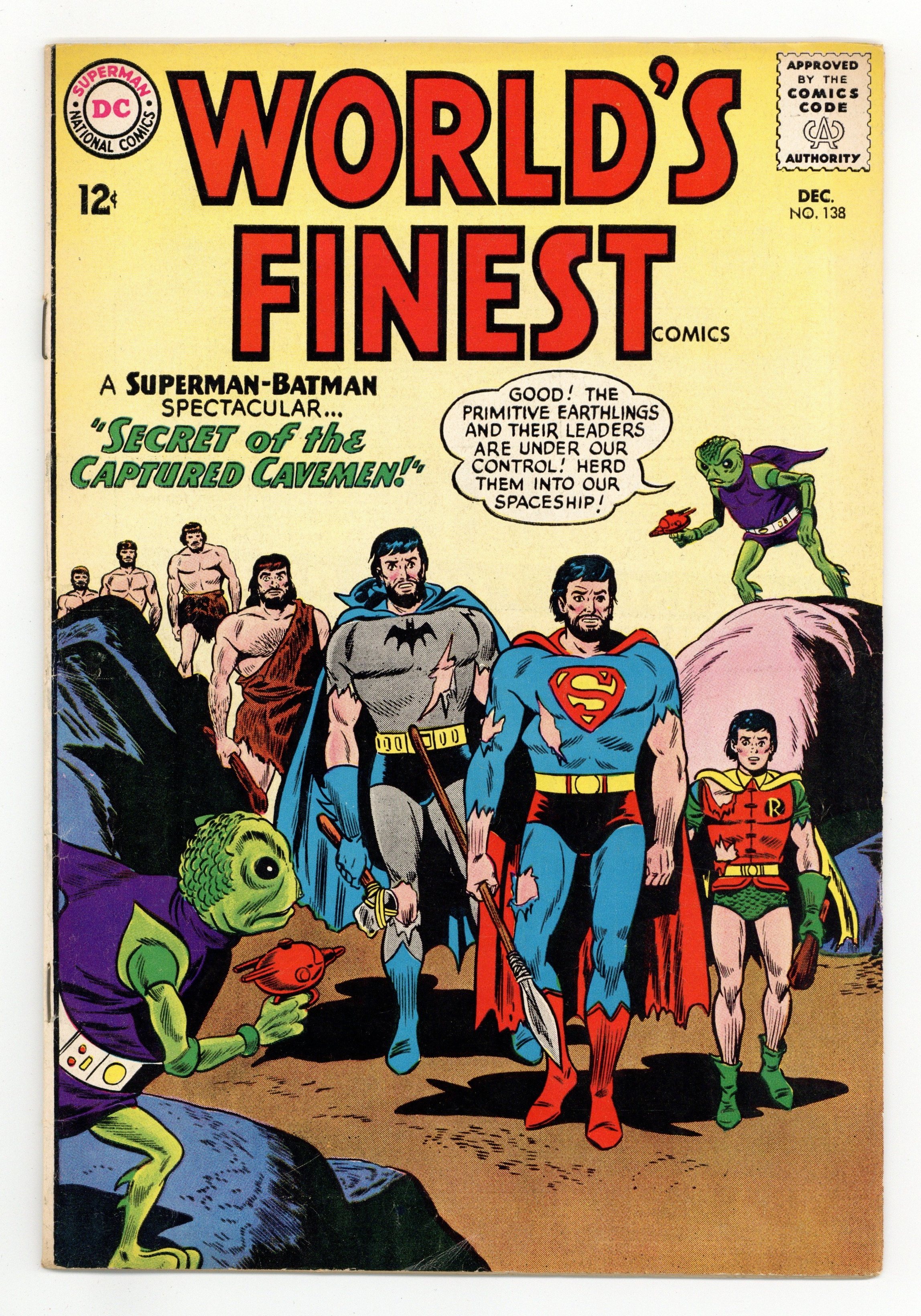 Cover pencils by Dick Dillin, inks by Sheldon Moldoff. Secret of the Captive Cavemen starring Superman and Batman, script by Bill Finger, art by Jim Mooney; Batman, Robin and Superman chase a mysterious alien into the prehistoric past. The Secret Face Of Funny-Arrow! starring Green Arrow, script by Ed Herron, art by Lee Elias; Green Arrow and Speedy must determine who is pulling robberies as Funny-Arrow. Peter Puptent, Explorer humor page by Henry Boltinoff. 36 Pages, Full Color. Cover price $0.12.