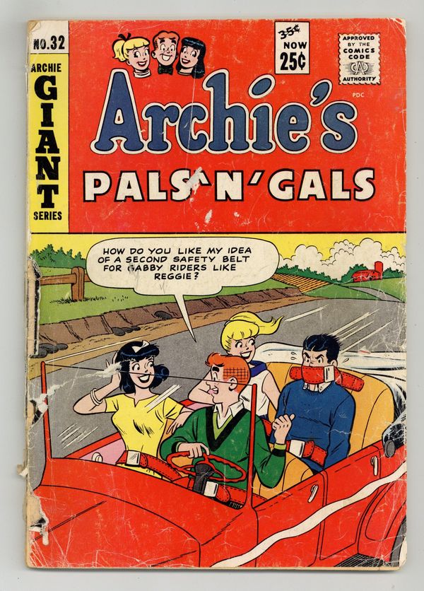 Canadian edition with $.35 cover price marked out and "NOW 25ยข". "Hair It Is!"; Veronica gets mad at Archie because he doesn't recognize her when she's wearing a wig. "Lawman"; Mr. Weatherbee enlists Archie to help track down a chronic truant named Billie Blake. "Where the Boys Are"; Veronica and Betty agree that they hate men and decide to get revenge by inviting as many as possible on dates for that night, and standing them up. "The Message"; Veronica asks Reggie to give Archie a message; But Reggie gives the message to Moose to pass on, figuring Moose will foul up the message and Archie's confusion will give Reggie time with Veronica. "Plane Facts"; Reggie tricks Archie into buying Veronica a gift she won't like. "A Change in Weather" one-page Li'l Jinx story by Joe Edwards. "Pass It On"; Archie goes to Veronica's house to tell her he's going to a boxing match with his dad instead of taking her to a dance, but Mr. Lodge and Reggie have a laugh at his expense. "The Heights of Humility"; Archie and Reggie each try to be more modest than the other. "Mister Nice Guy"; Archie's positive attitude irritates Reggie and Jughead; Reggie enlists Moose in an attempt to sour him, but it doesn't work. 68 pgs., full color. Cover price $0.25.