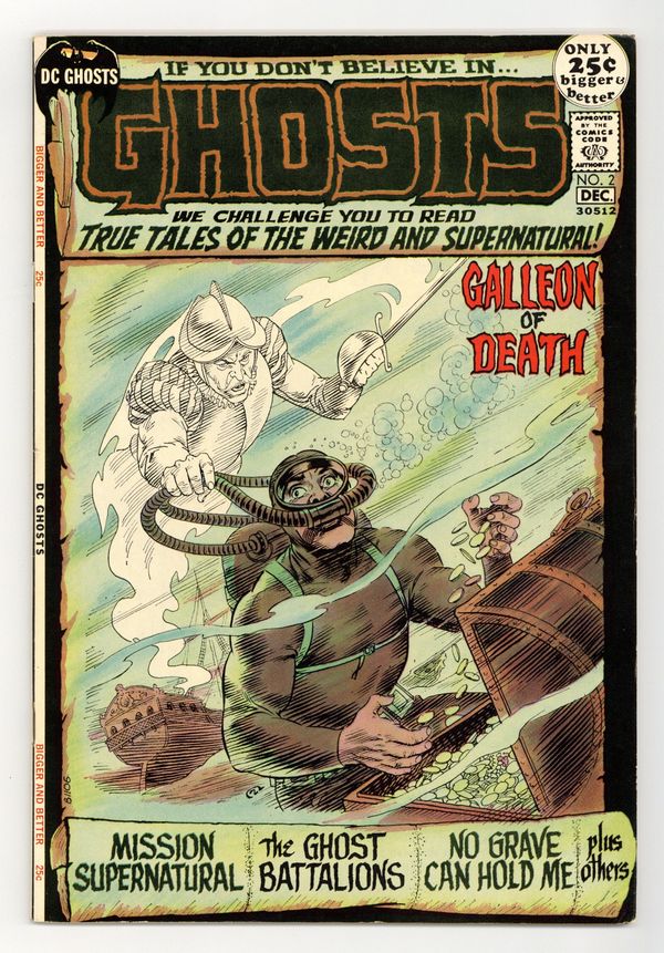 Cover art by Nick Cardy. No Grave Can Hold Me!, script by Leo Dorfman, pencils by John Calnan, inks by George Tuska; Istvan is haunted by the ghost of Zenna Prohl who he accused of being a witch so he could get her land. Mission Supernatural, script by Leo Dorfman, pencils by Bob Brown, inks by Wally Wood; Leftenet Jordan's ghost still flies the foggy skies over England looking for his landing strip. The Sorrow of the Spirits!, script by Jack Miller, pencils by Curt Swan, inks by Ray Burnley; Conrad Ganges has found a way to see the spirit world and to communicate with its inhabitants. Enter the Ghost!, script by Joe Samachson, art by Ruben Moreira; Winters is an actor performing a play forbidden in the town; Lord Boynton has sworn to return from the grave to kill anyone attempting to mount the play. The Ghost Battalions, script by Leo Dorfman, art by Sam Glanzman; Groups of soldiers have been disappearing into thin air all throughout history; Did Shelby's men suffer the same fate? 52 pgs. $0.25. Cover price $0.25.
