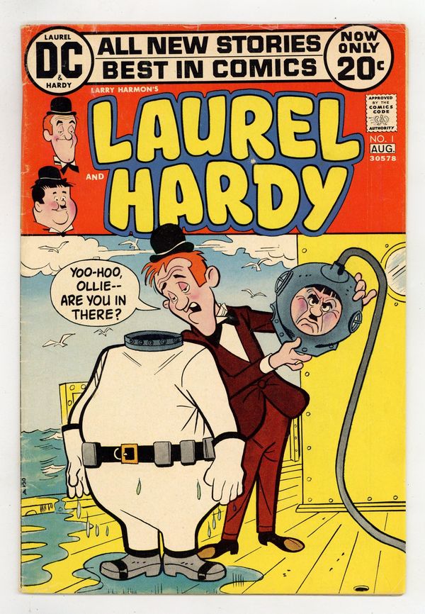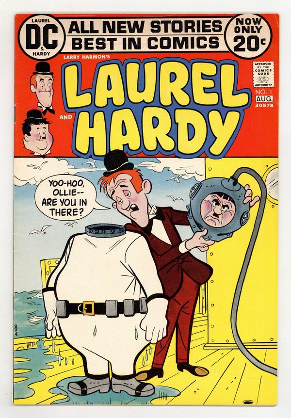 First and only issue of the series based on the Laurel and Hardy animated cartoons produced by Larry Harmon (aka Bozo the Clown). Stan and Ollie hide out in the desert after enraging a paleontologist. The boys are such poor private detectives that their pants get stolen. Art by Mike Sekowsky and Alan Kupperberg, among others. 36 pages, full color. Cover price $0.20.