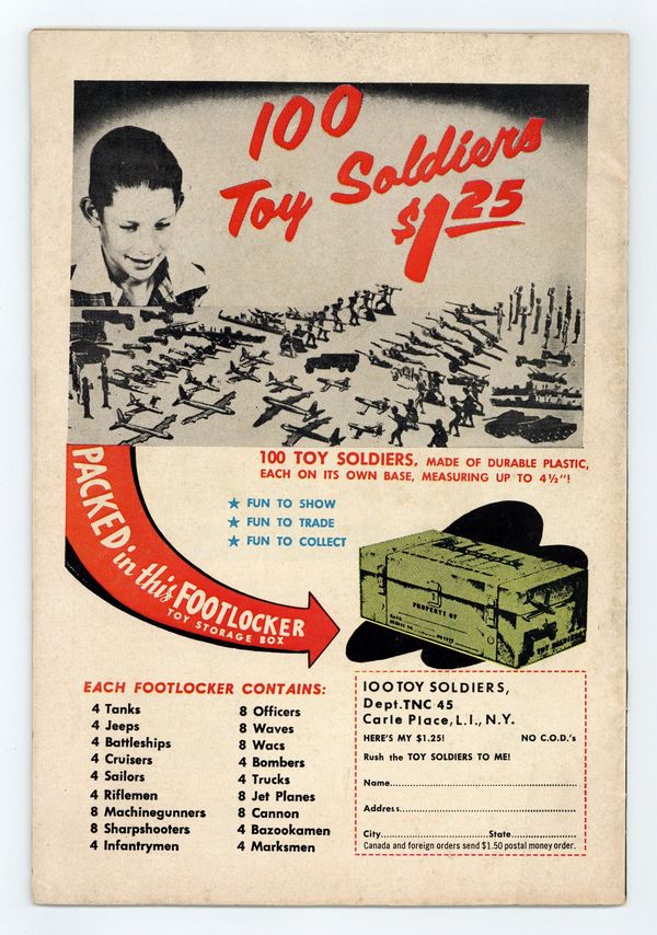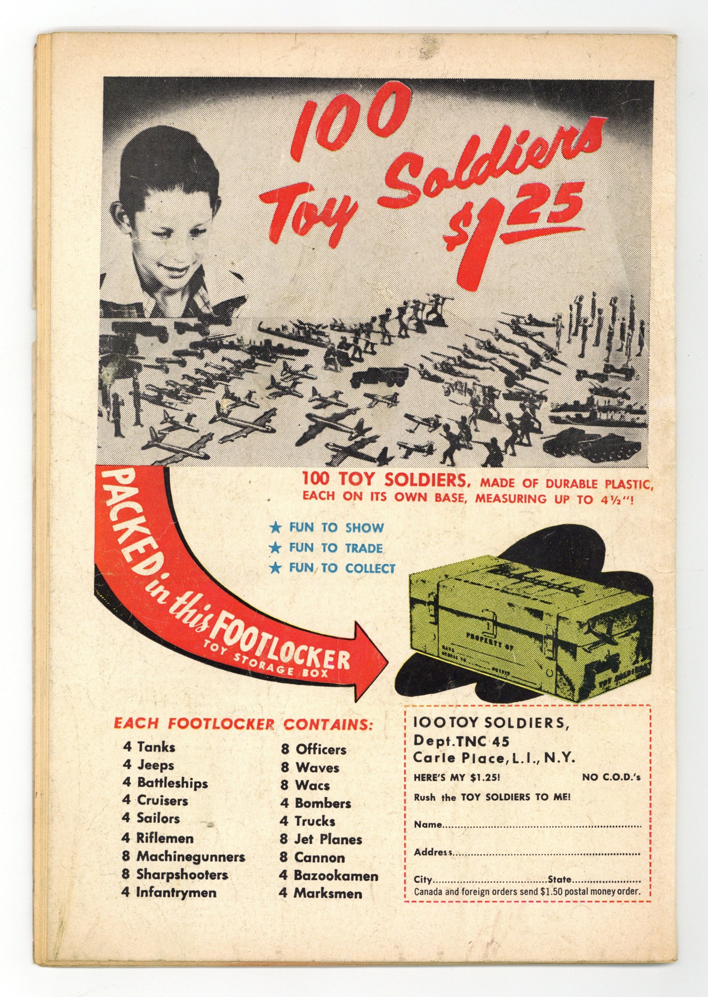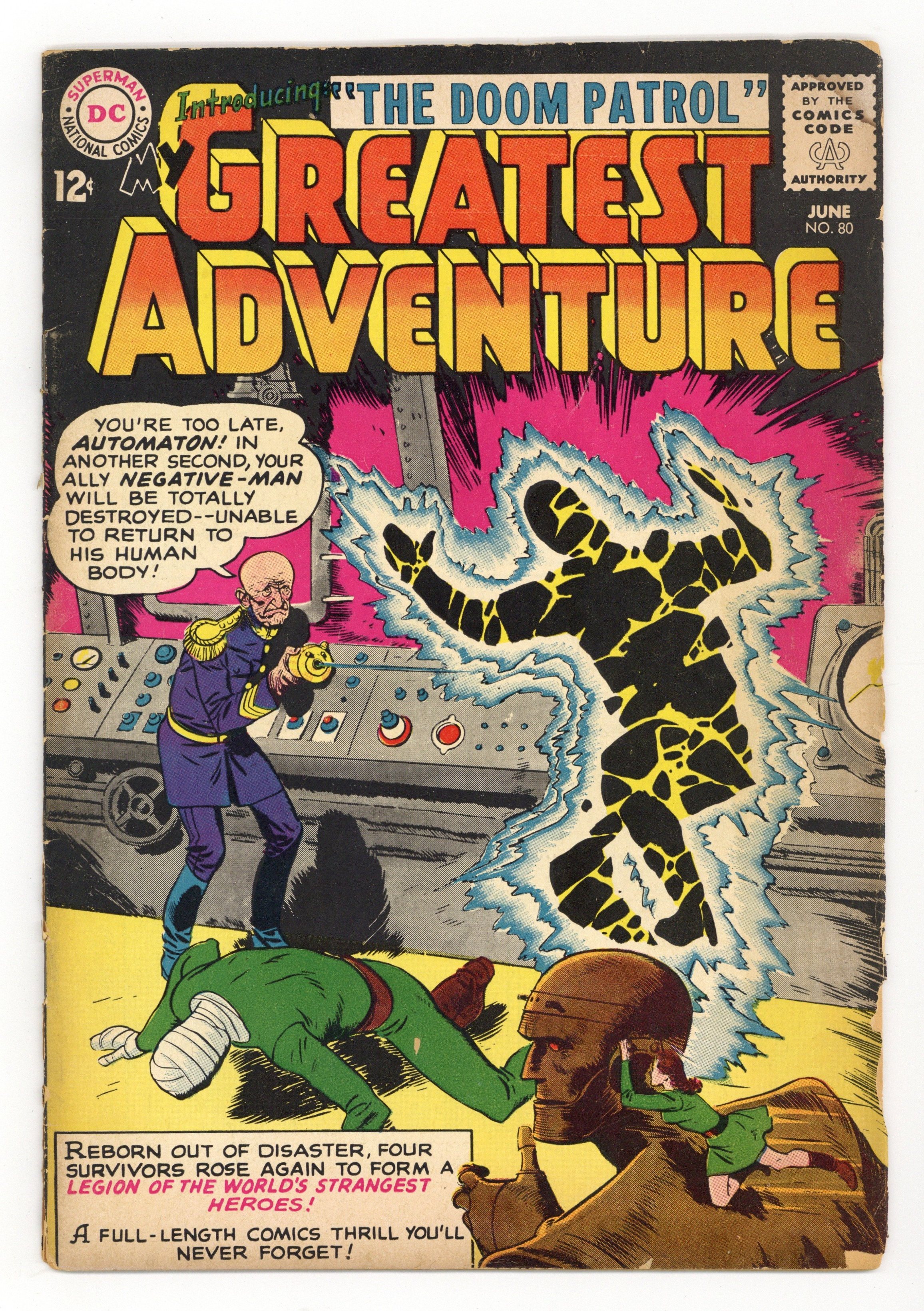 Cover art by Bruno Premiani. The Doom Patrol (Chapter 1), script by Arnold Drake and Bob Haney, art by Bruno Premiani; A mysterious man known only as the Chief calls three people who have all escaped certain doom but were left outcasts because of their experiences. Peter Puptent Explorer humor page by Henry Boltinoff. The Challenge of the Timeless Commander (Chapter 2), script by Arnold Drake and Bob Haney, art by Bruno Premiani; The Chief informs the Doom Patrol of an alien spaceship that has landed on Earth carrying a super-weapon. Science Shorts filler page by Henry Boltinoff. The Deadly Duel with Gen. Immortus (Chapter 3), script by Arnold Drake and Bob Haney, art by Bruno Premiani; After locating the super-weapon, the Doom Patrol is confronted by General Immortus, who takes the upper-hand. 36 Pages, Full Color. Cover price $0.12.