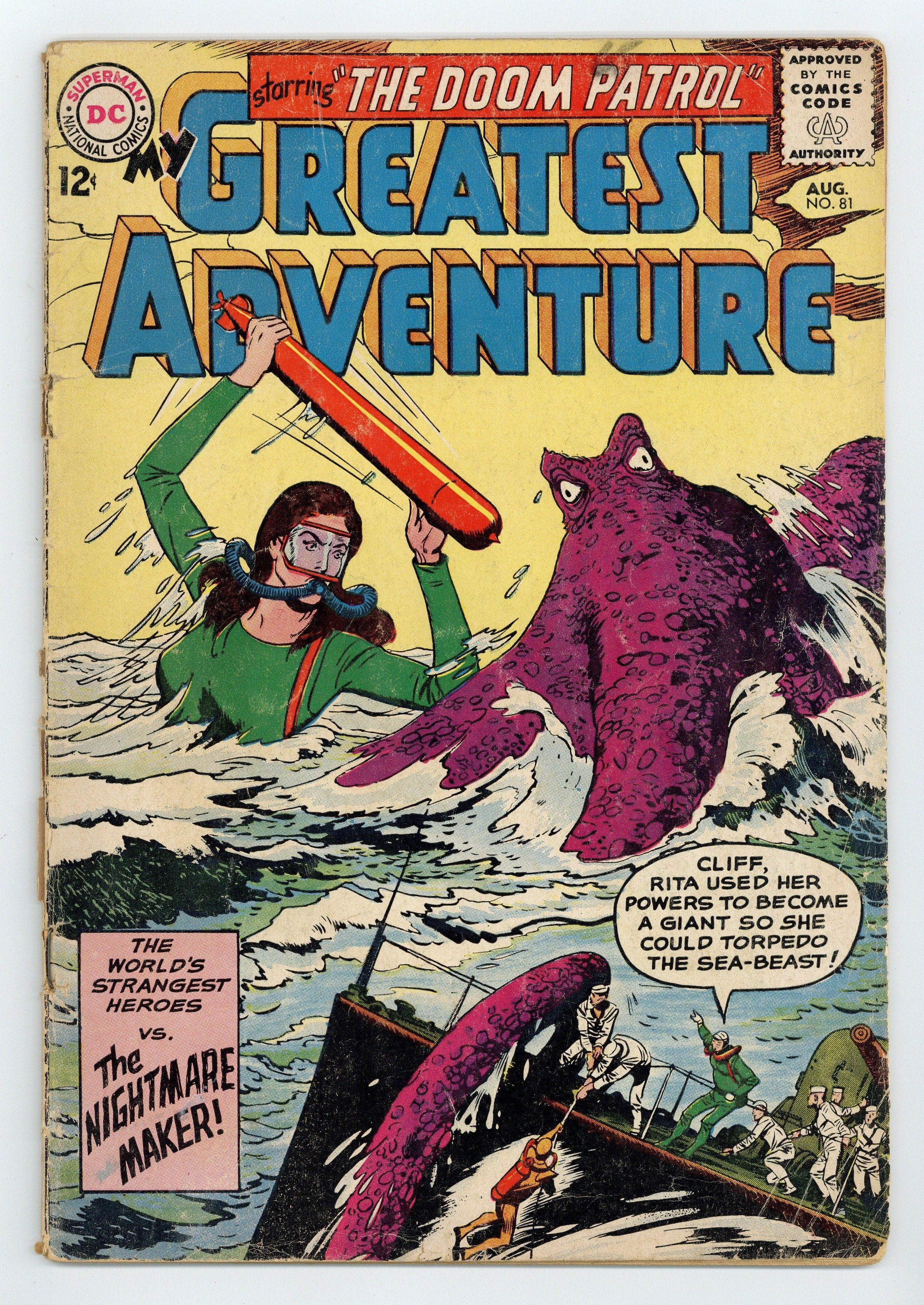 Cover art by Bruno Premiani. The Nightmare Maker (part 1), script by Arnold Drake and Bob Haney, art by Bruno Premiani; The Doom Patrol encounter strange beasts on two missions, and a TV report by Dr. Janus remarks that they are beasts from a meteorite that hit Earth fifteen years ago which, according to eyewitnesses, had living being within. Doorway to Disaster (part 2), script by Arnold Drake and Bob Haney, art by Bruno Premiani; Although news reports confirm the meteorite story, the Chief sends the Doom Patrol to the crash site, Logan City, Arizona, to investigate. Listen, World...I'm the Missing Link, art by Alex Toth. 36 Pages, Full Color. Cover price $0.12.