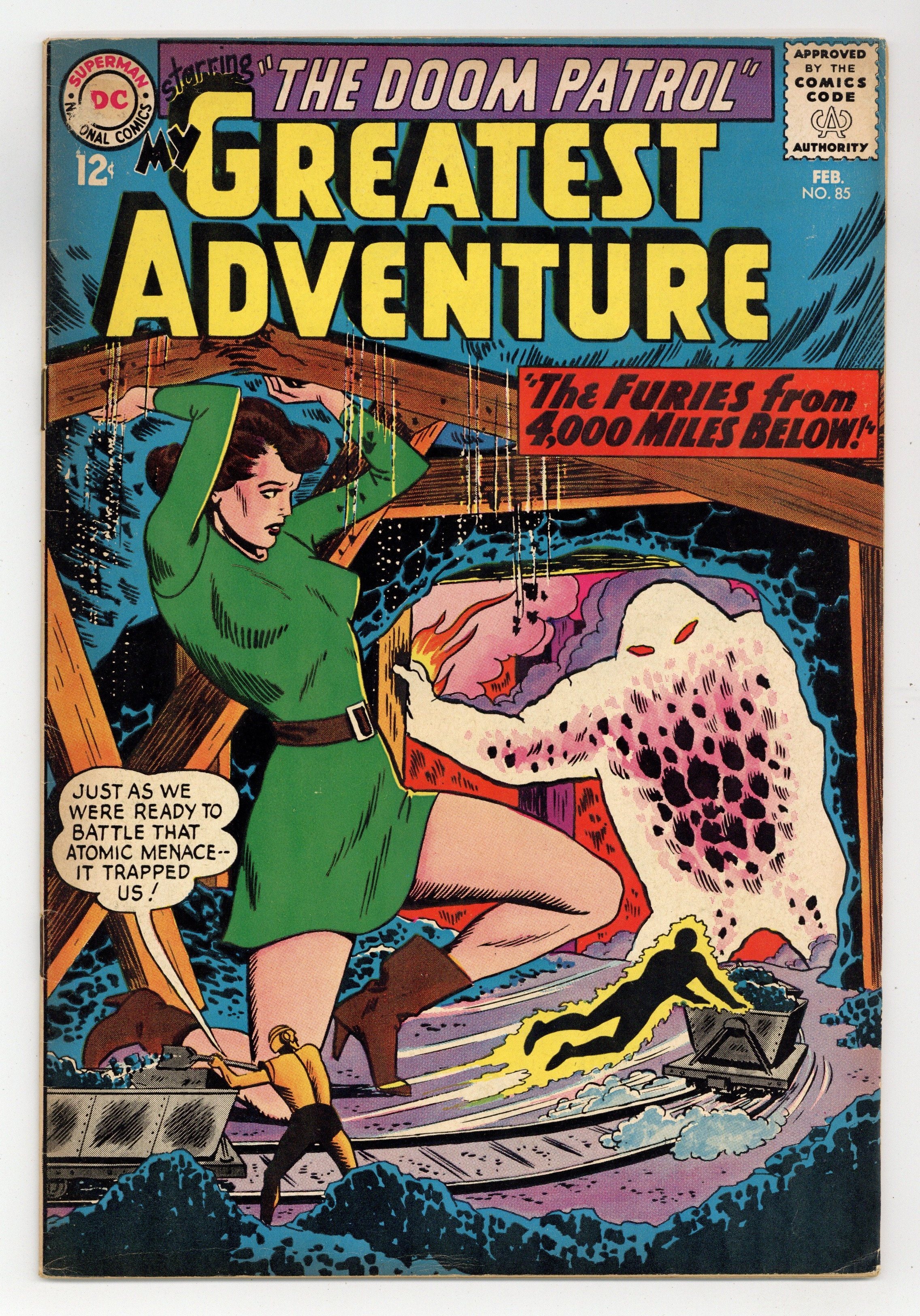 The Doom Patrol stars in "The Furies From 4,000 Miles Below." Back-up story: "The Curse of the Cat's Cradle" (art by Alex Toth). This is the last issue under the title My Greatest Adventure. With issue #86, title becomes The Doom Patrol. 36 Pages, Full Color. Cover price $0.12.