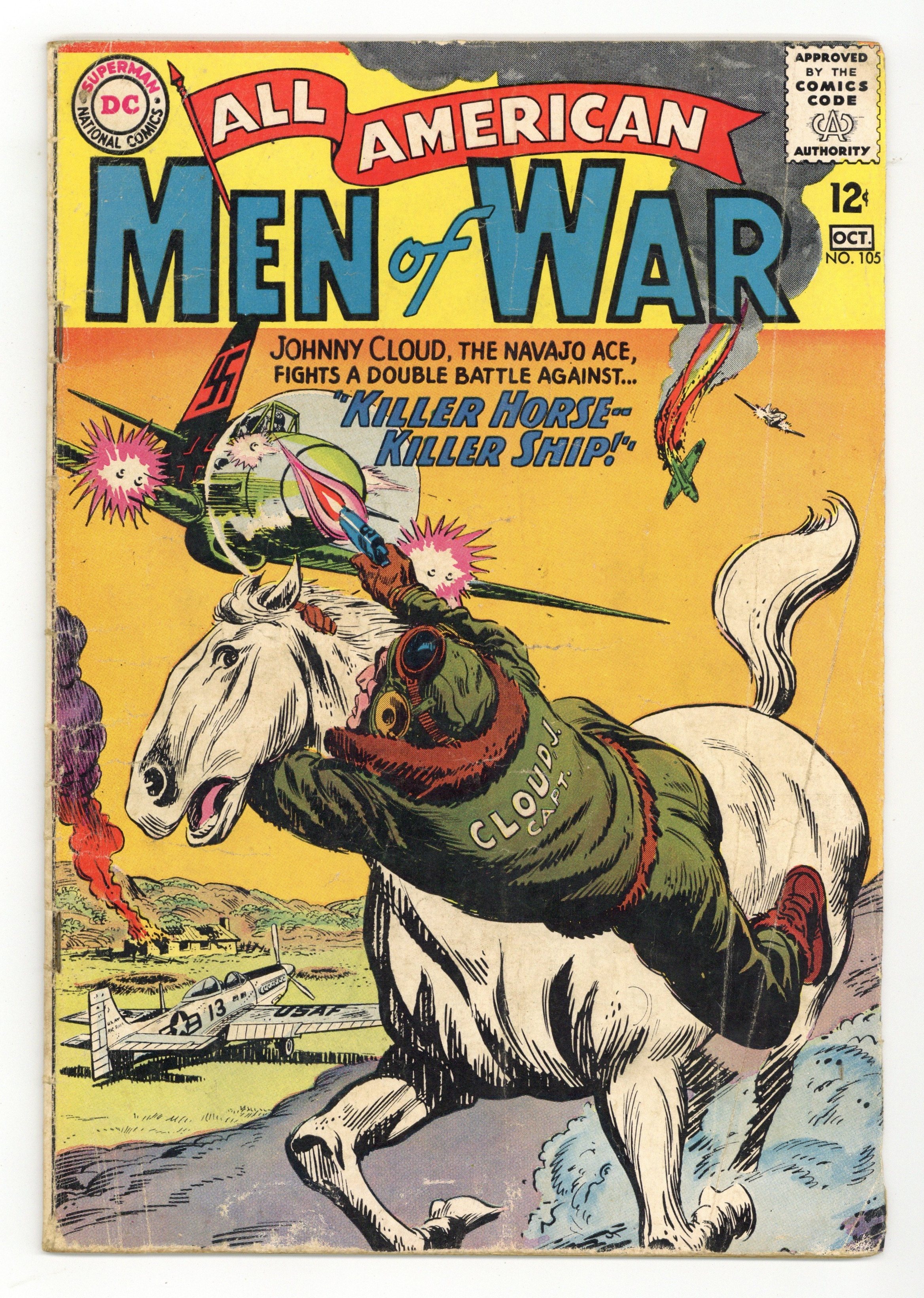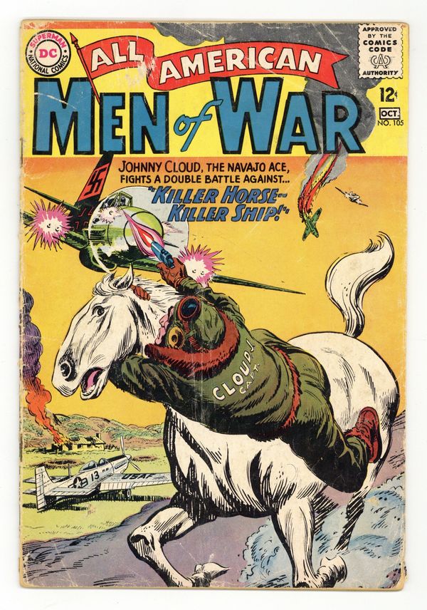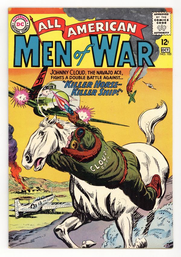 Johnny Cloud in "Killer Horse--Ship!" Also in this issue, "Tunnel Dogfight!" Edited by Robert Kanigher. Cover by Irv Novick. Stories by Robert Kanigher, Irv Novick, Hank Chapman, Jack Abel. Adventure tales of war and the military, including some humor—go into combat with All American Men of War! Ad for 80 Page Giant #2 featuring Jimmy Olsen. American Military Ornaments, written by Morris Waldinger, art by Morris Waldinger and Tom Nicolisi. 36 Pages, Full Color. Cover price $0.12.