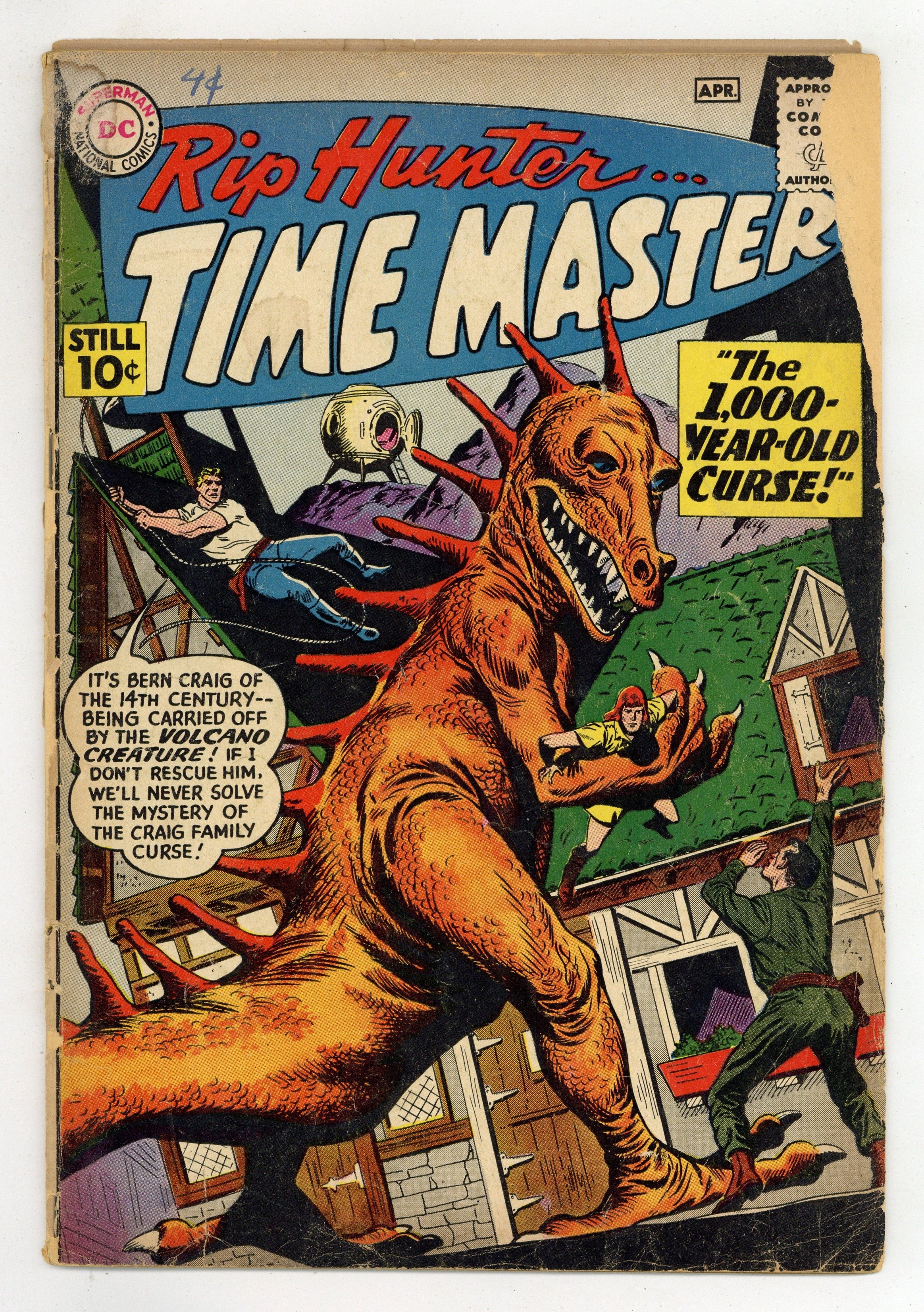 Written by Jack Miller. Art and Cover by Ross Andru and Mike Esposito. It's Bern Craig of the 14th century -- being carried off by the volcano creature! If Rip Hunter doesn't rescue him, they'll never solve the mystery of the Craig family curse! Don't miss the 3-part tale by Jack Miller, Ross Andru and Mike Esposito: "The Thousand-Year-Old Curse"; "Chapter 2: The Secret of the Volcano Creature"; and "Chapter 3: The Wizard of the 10th Century"! Plus: 1-page text story "King of the Forbidden Tribe"! 32 pages, full color. Cover price $0.10.
