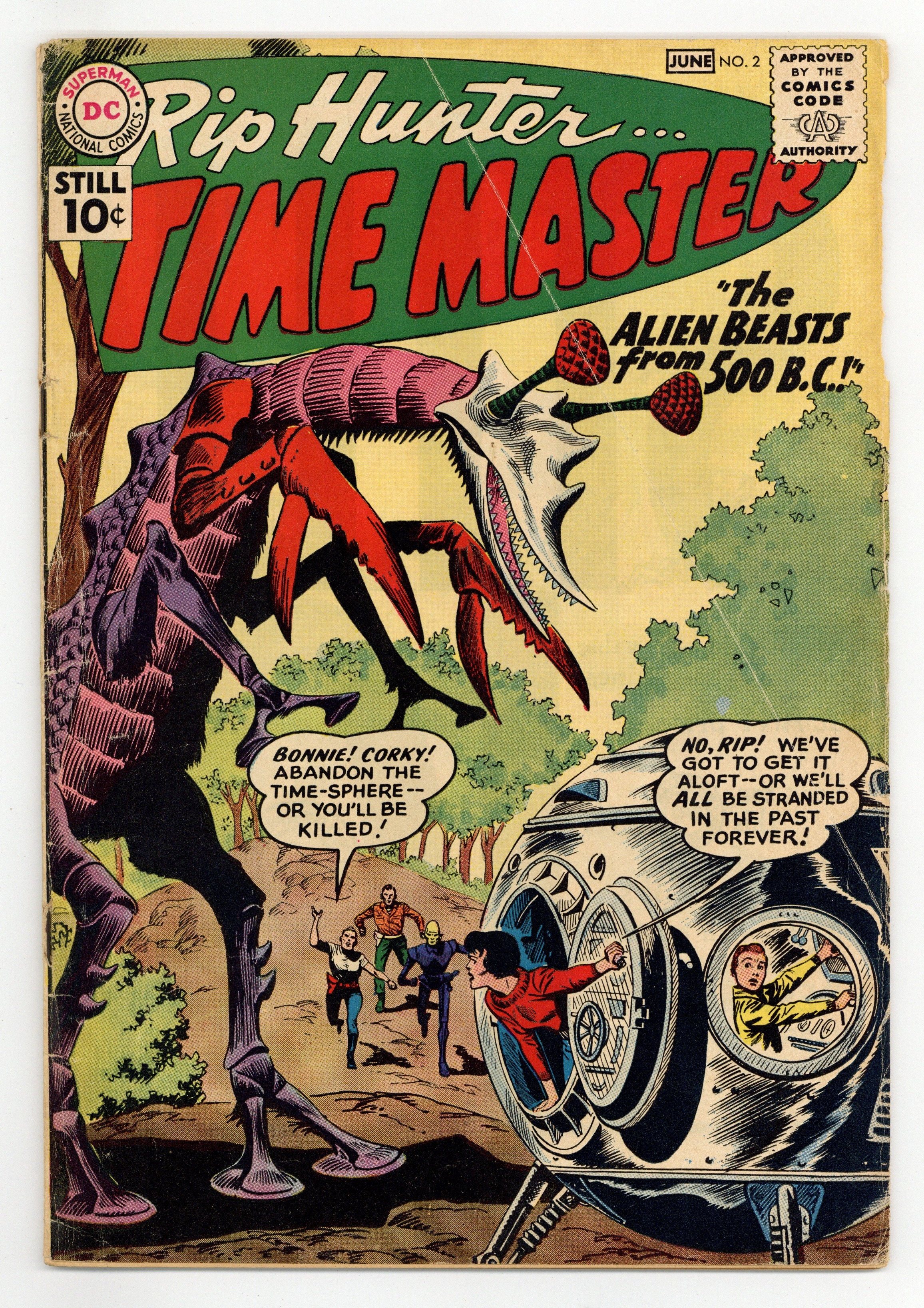 Written by Jack Miller. Art and Cover by Ross Andru and Mike Esposito. Bonnie Baxter and Corky Baxter must abandon the Time Sphere...or they'll be killed! But no...they've got to get it aloft...or they'll all be stranded in the past forever! Don't miss Rip Hunter in the 3-part tale by Jack Miller, Ross Andru and Mike Esposito: "The Alien Beasts from 500 B.C."; "Chapter 2: The Battle of the Alien Beasts"; and "Chapter 3: Rip Hunter's Last Stand"! Plus: 1-page text story "The Anti-Time Island"! 32 pages, full color. Cover price $0.10.