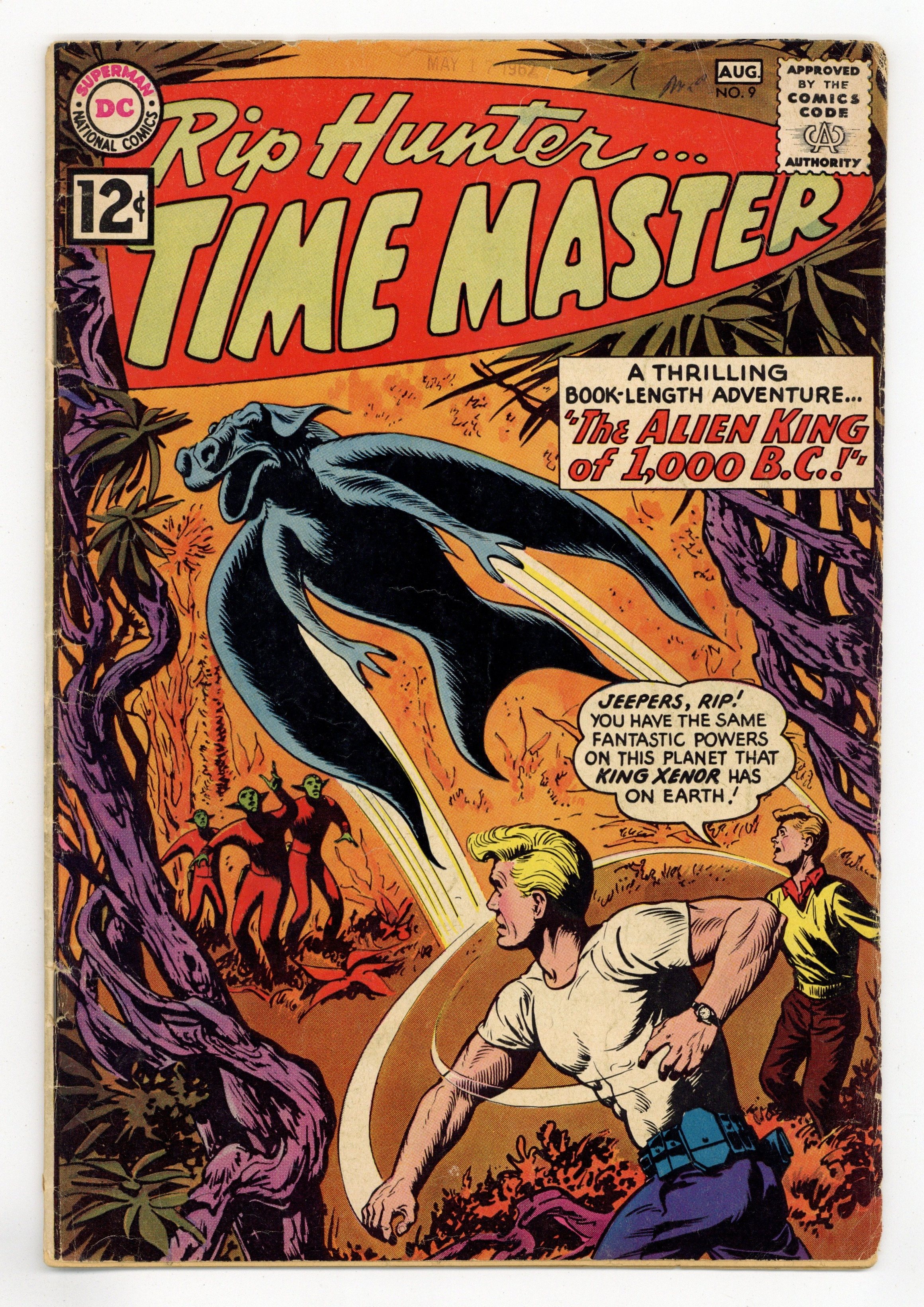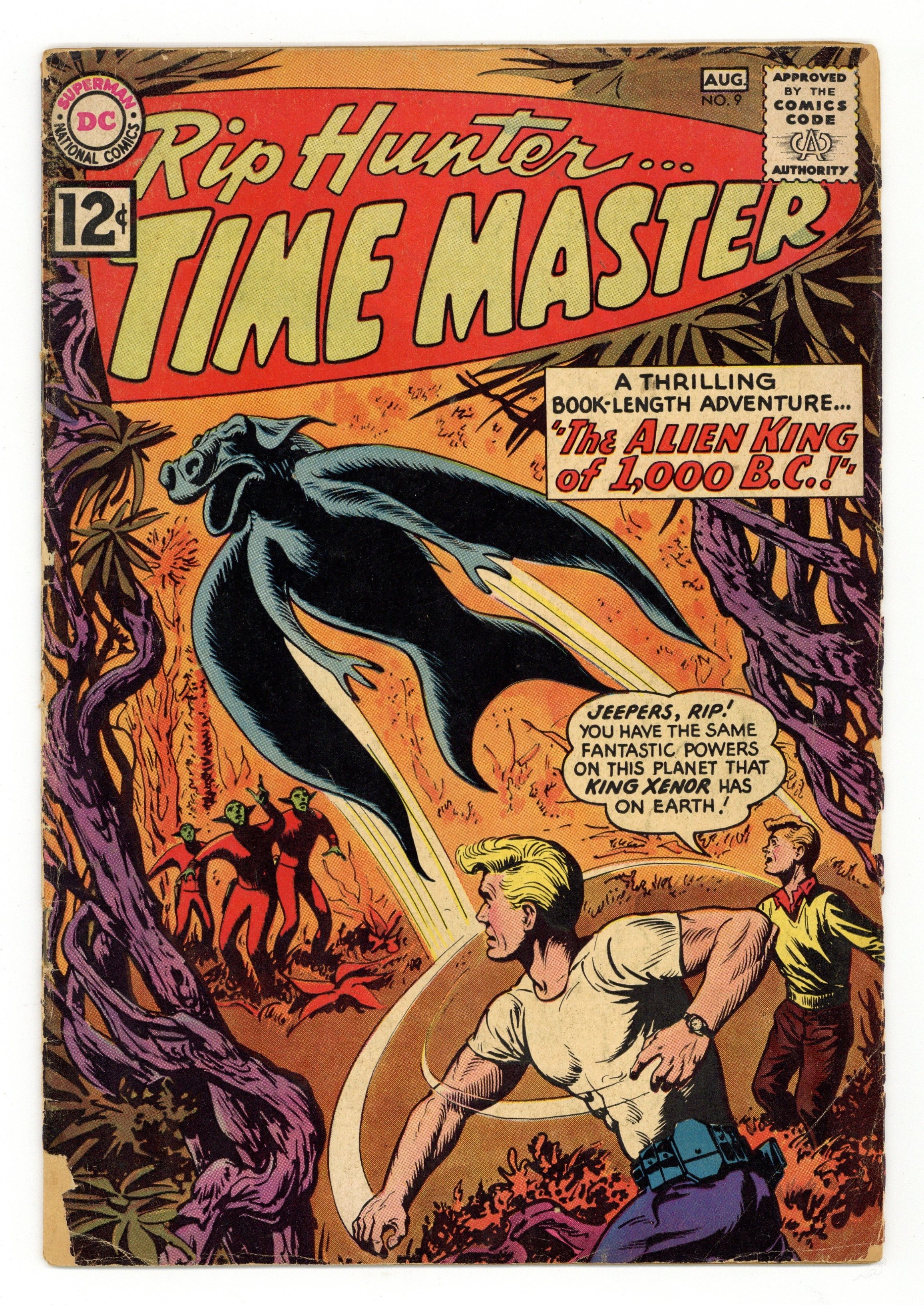 Written by Jack Miller. Art and Cover by Bill Ely. Rip Hunter finds that he has the same fantastic powers on an alien planet that King Xenor has on Earth! Don't miss the thrilling 3-part adventure by Jack Miller and Bill Ely: "The Alien King of 1,000 B.C."; "Chapter 2: Adventure on Planet Zark"; and "Chapter 3: One-Man Alien Army"! Plus: 1-page text story "The Great Time-Travel Hoax"! Also: Superman stars in the 1-page public service announcement "Be a Good Citizen!" by Jack Schiff and Sheldon Moldoff. 32 pages, full color. Cover price $0.12.