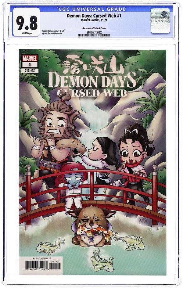 The Yashida Saga: Part 2 - Story and Art by Peach Momoko. Cover by Agnes Garbowska. SPIDERS AND WOLVES AND YOKAI… OH MY! Mariko Yashida journeys deep into a dark forest to find answers about her past. Instead, she finds a magical wolf with three toes and a strange girl with a pet spider. But there are deadly creatures in these woods too - a mysterious, blue-skinned woman and a giant with super-strength and claws - and they're after Mariko! Don't miss this epic tale, straight from the creative mind of STORMBREAKER PEACH MOMOKO! Book THREE of FIVE of the DEMON DAYS saga! 36 pages, full color. Rated T+ Cover price $4.99.