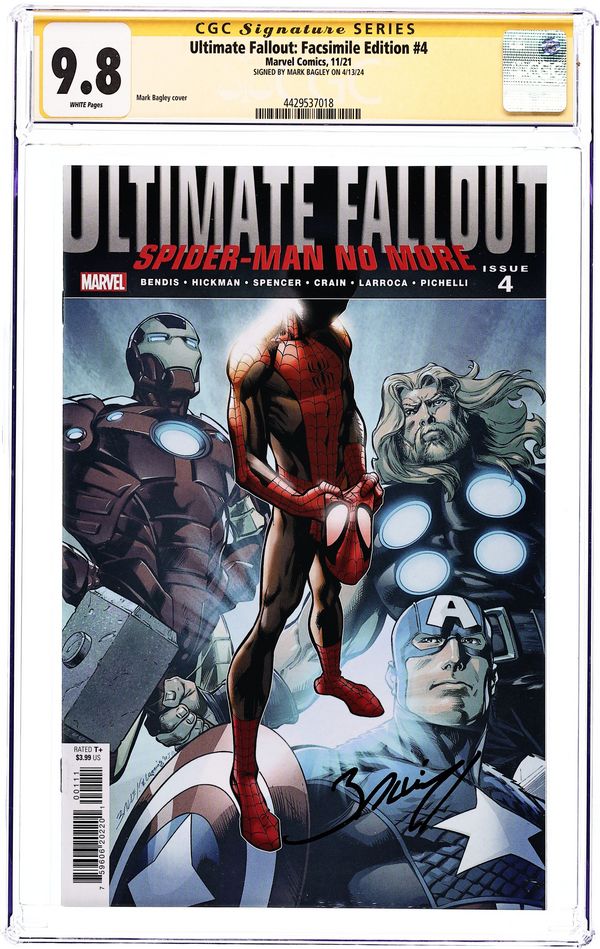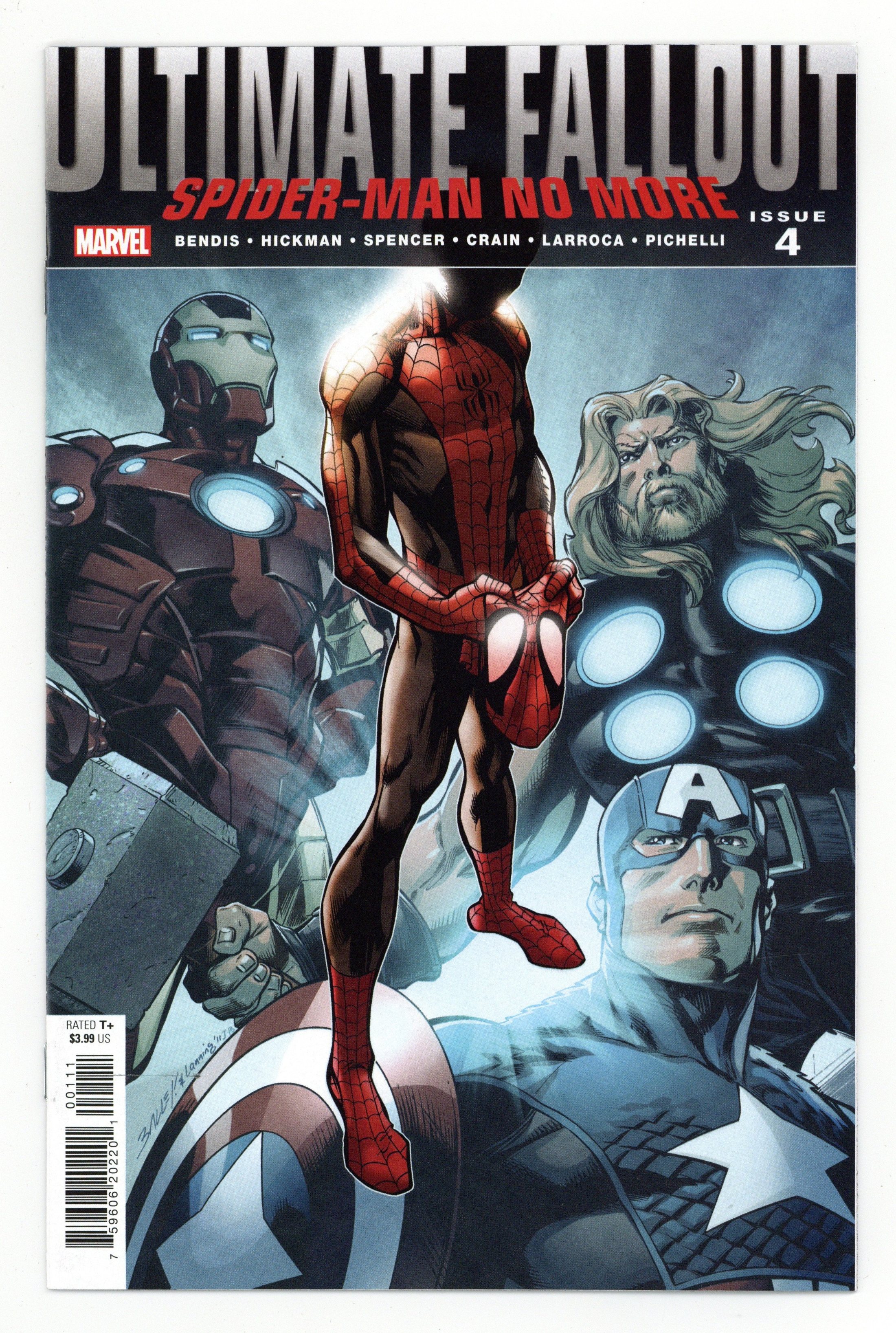 Written by Brian Michael Bendis, More. Art by Sara Pichelli, More. Cover by Mark Bagley. As the Ultimate Universe mourns the loss of Peter Parker, a new Spider-Man for the modern era makes his debut - and he's destined to be a star! The super criminal calling himself the Kangaroo is causing trouble in New York City, safe in the knowledge that Spidey is dead - when a young web-slinger wearing a familiar suit swings in to make the neighborhood his own! But who exactly is under that famous mask? Prepare to get your first glimpse of Miles Morales all over again! Plus: Reed Richards bears the scars of his recent ordeals - and he is determined to solve everything! And Valerie Cooper grapples with a huge secret that will change the world! It's one of the all-time great Marvel comic books, boldly re-presented in its original form, ads and all! Reprinting ULTIMATE FALLOUT #4. 32 pages, full color. Rated T+ Cover price $3.99.