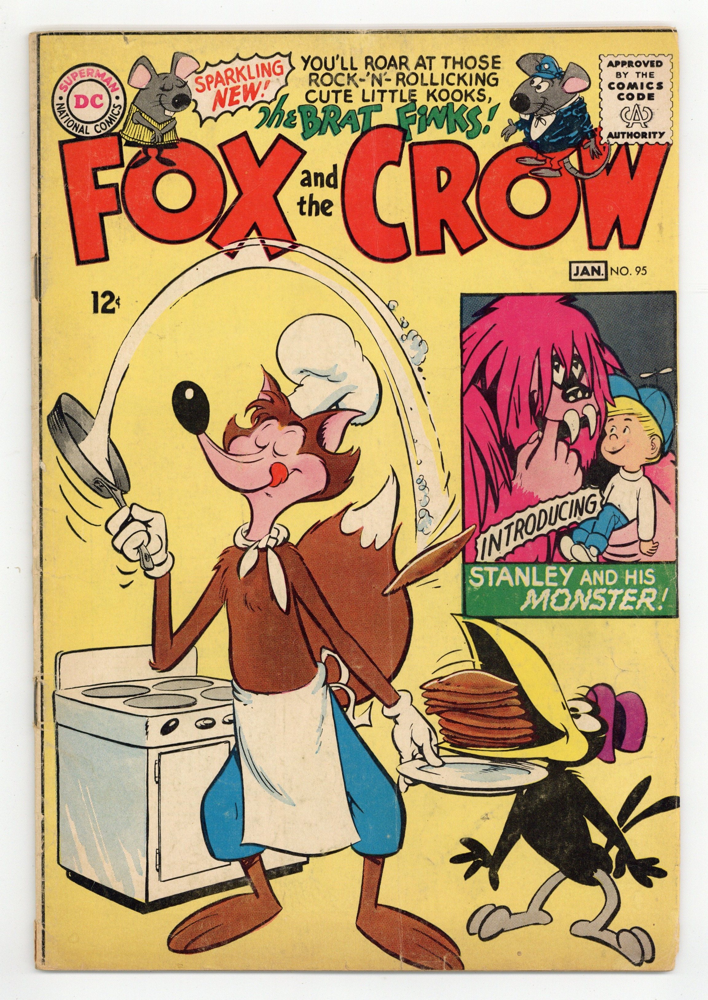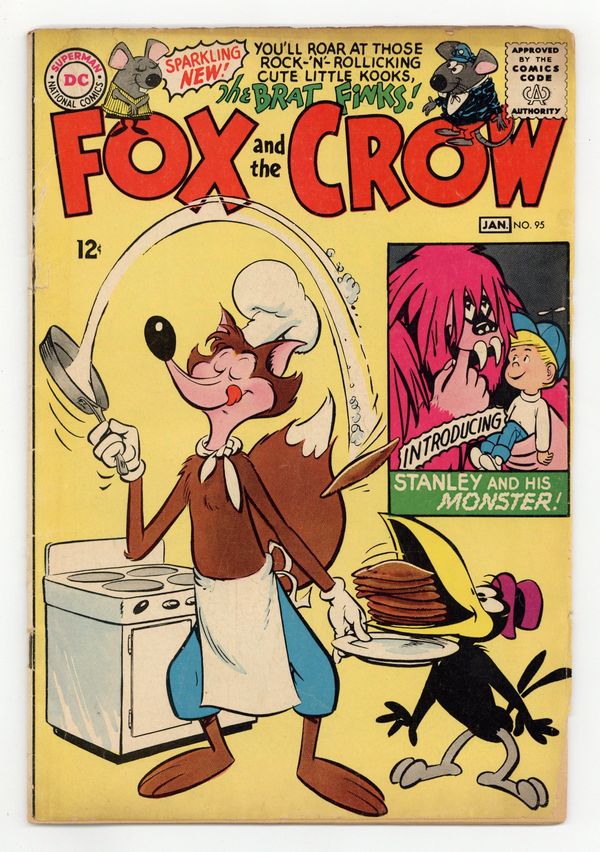 1st Appearance of Stanley & His Monster. Cover art by Mort Drucker. When Is a Dog Not a Dog? starring Stanley and His Monster, script by Arnold Drake, art by Win Mortimer; Stanley Dover's parents worry about his overactive imagination, but they won't let him have a dog. When he brings home a giant pink monster that he found in the sewer, no one notices. Untitled The Fox and the Crow story, script by Cecil Beard, art by James F. Davis; Crow has his own obituary published so that he can pretend to be a ghost and annoy Fox even more than usual. Untitled The Brat Finks story, script by Paul Laikin and Bill Finger, art by Bob Oksner; The brats go to the station to pick up Cousin Reggie but they bring back the wrong guy. 36 Pages, Full Color. Cover price $0.12.