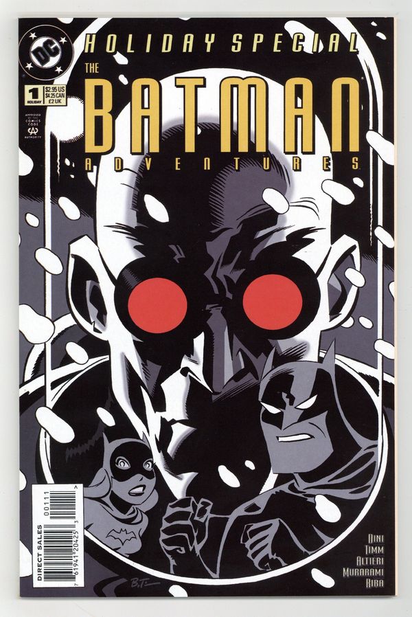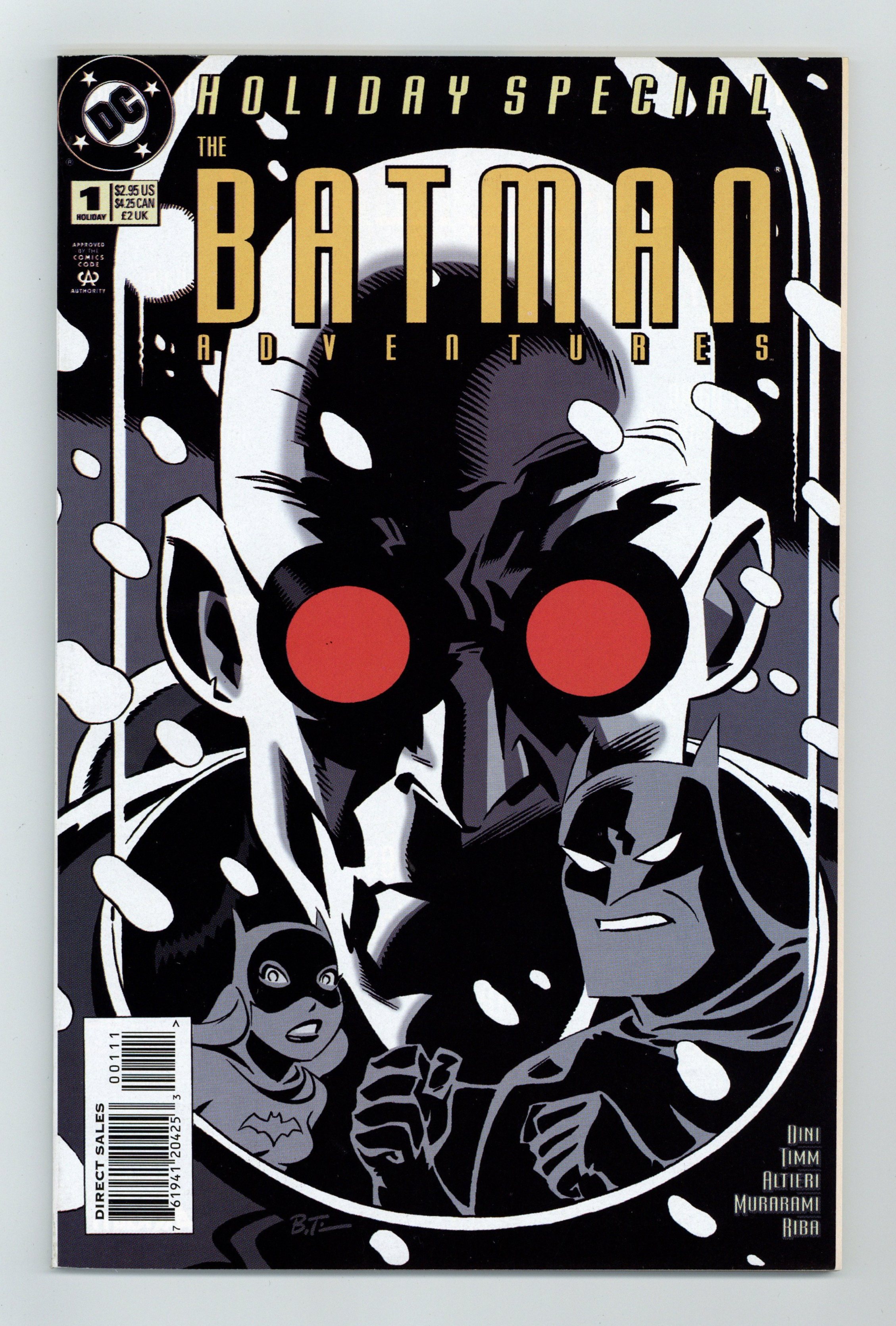 Cover by Bruce Timm. Stories by Paul Dini with Bruce Timm and Ronnie Del Carmen. Art by Bruce Timm, Ronnie Del Carmen, Kevin Altieri & Butch Lukic, Dan Riba and Glen Murakami. December in Gotham City -- that's the theme of THE BATMAN ADVENTURES HOLIDAY SPECIAL, a 64-page one-shot special featuring five thrilling, funny or touching yuletide stories by a slew of creators from The Adventures of Batman & Robin, the hit cartoon from Warner Bros. Animation. Emmy award-winning writer/producer Paul Dini writes all five stories. Art for the lead feature "Jolly Ol' St. Nicholas," featuring Detective Harvey Bullock teaming with Batgirl in a tense battle against Clayface, is by director/producer Bruce Timm, Dini's collaborator on the Eisner and Harvey Award-winning THE BATMAN ADVENTURES: MAD LOVE. Also in the Special, artist Ronnie Del Carmen illustrates "The Harley and the Ivy," a tale of Harley Quinn and Poison Ivy in which the duo kidnaps millionaire Bruce Wayne so they can go on an unlimited shopping spree. A madcap New Year's Eve with the Joker is the subject of "What Are You Doing New Year's Eve?", the story pencilled by director Kevin Altieri, while elsewhere, Batman and Commissioner Gordon take time out to share some New Year's cheer in "Should Old Acquaintance Be Forgot," with art by director Dan Riba. And the icing of Gotham City is just the beginning of the poignant Mr. Freeze story "White Christmas," illustrated by artist Glen Murakami. 64 pages, full color. Cover price $2.95.