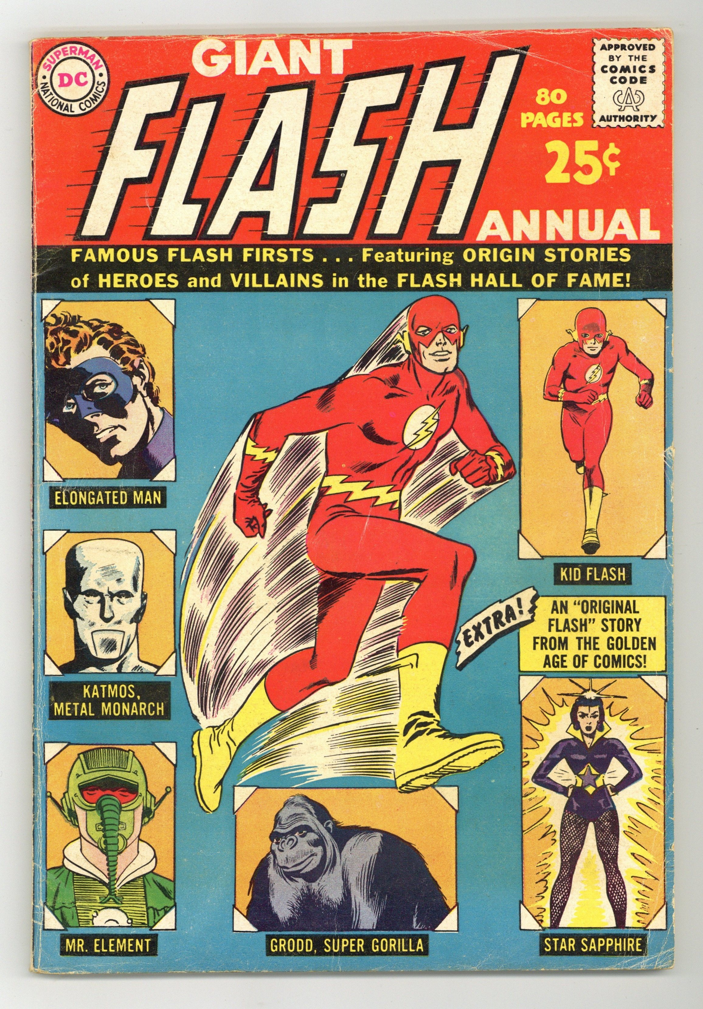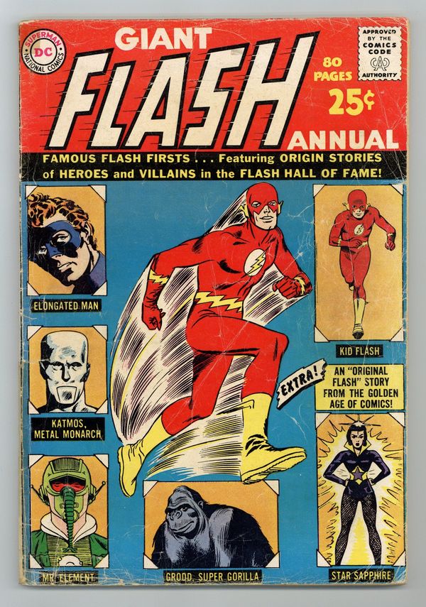 80-page Giant Size Annual. All reprints. Stories include "Conqueror From 8 Million B. C.," "Master of the Elements," "Mystery of the Elongated Man," "The Amazing Star Sapphire," "Menace of the Super-Gorilla," "Meet Kid Flash"; plus "How I Draw The Flash" (2 pages by Carmine Infantino); Famous Flash cover firsts; and a Flash index (issues 105-140, plus the Showcase issues featuring the Flash). Cover price $0.25.