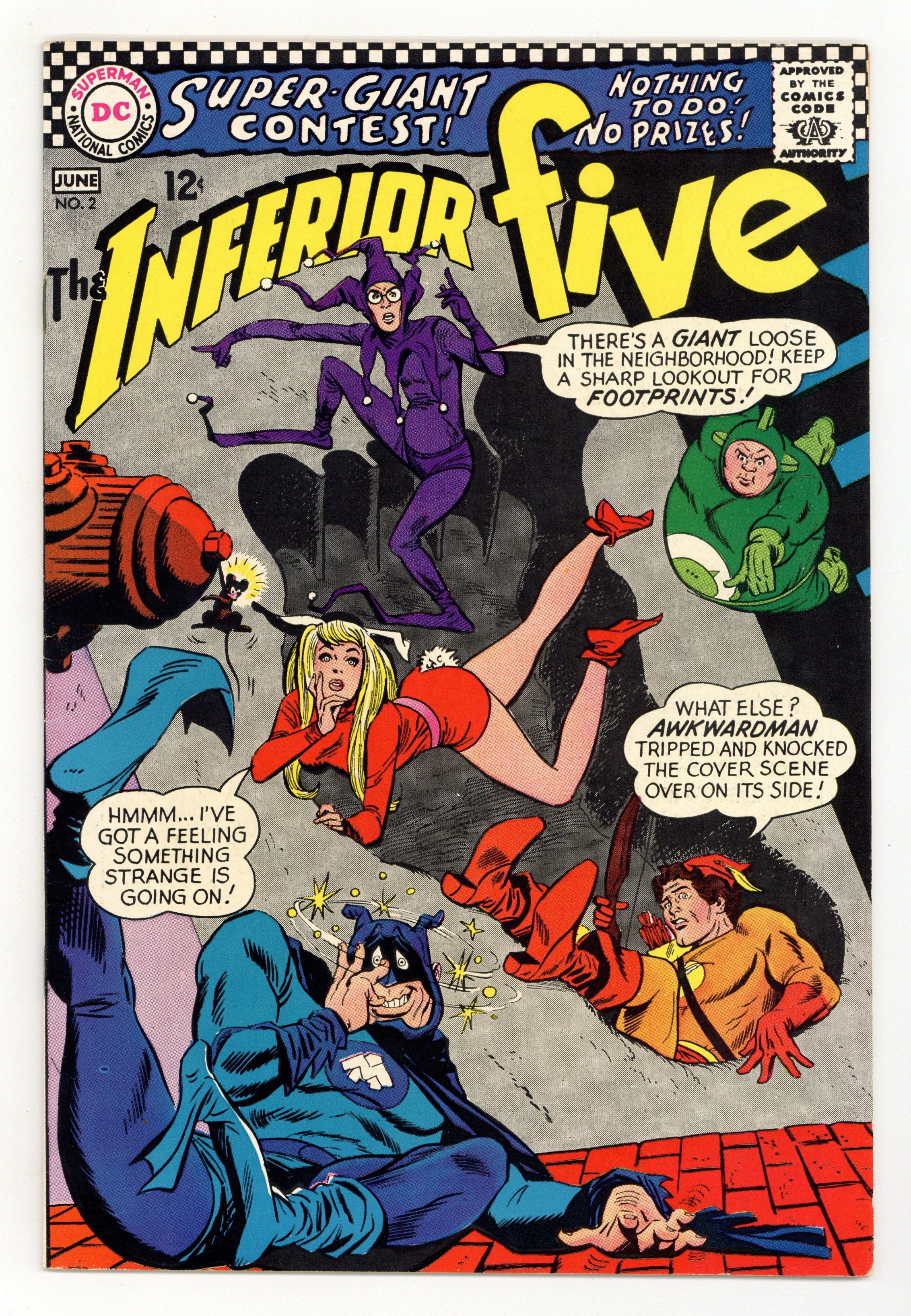 "The House-Hunting Heroes." The Inferior Five compete with the Kookie Quartet (a parody of Marvel's Fantastic Four) to capture King-Size and Terrible Tse-Tse (villains based on Marvel's Giant-Man and the Wasp). Plastic Man makes an appearance to chastise the Quartet's Mr. Manplastic. Script by E. Nelson Bridwell, pencils by Mike Sekowsky, inks by Mike Esposito. Cover by Sekowsky and Esposito. Cover price $0.12.