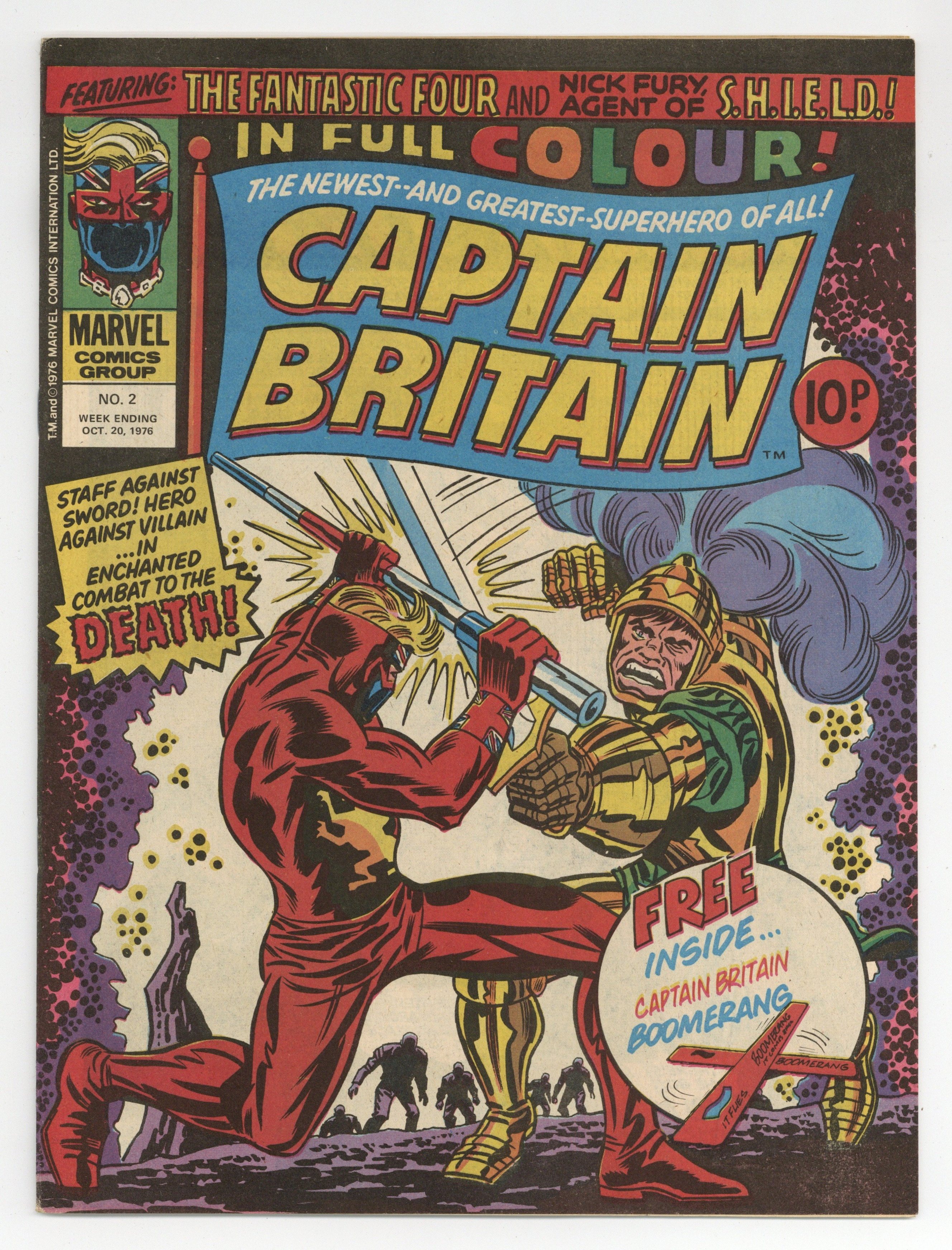 Comes with Captain Britian boomerang. Magazine size weekly British edition comic published weekly by Marvel Comics International. 32 pages. Cover and 13 interior pages in full color, rest black and white.