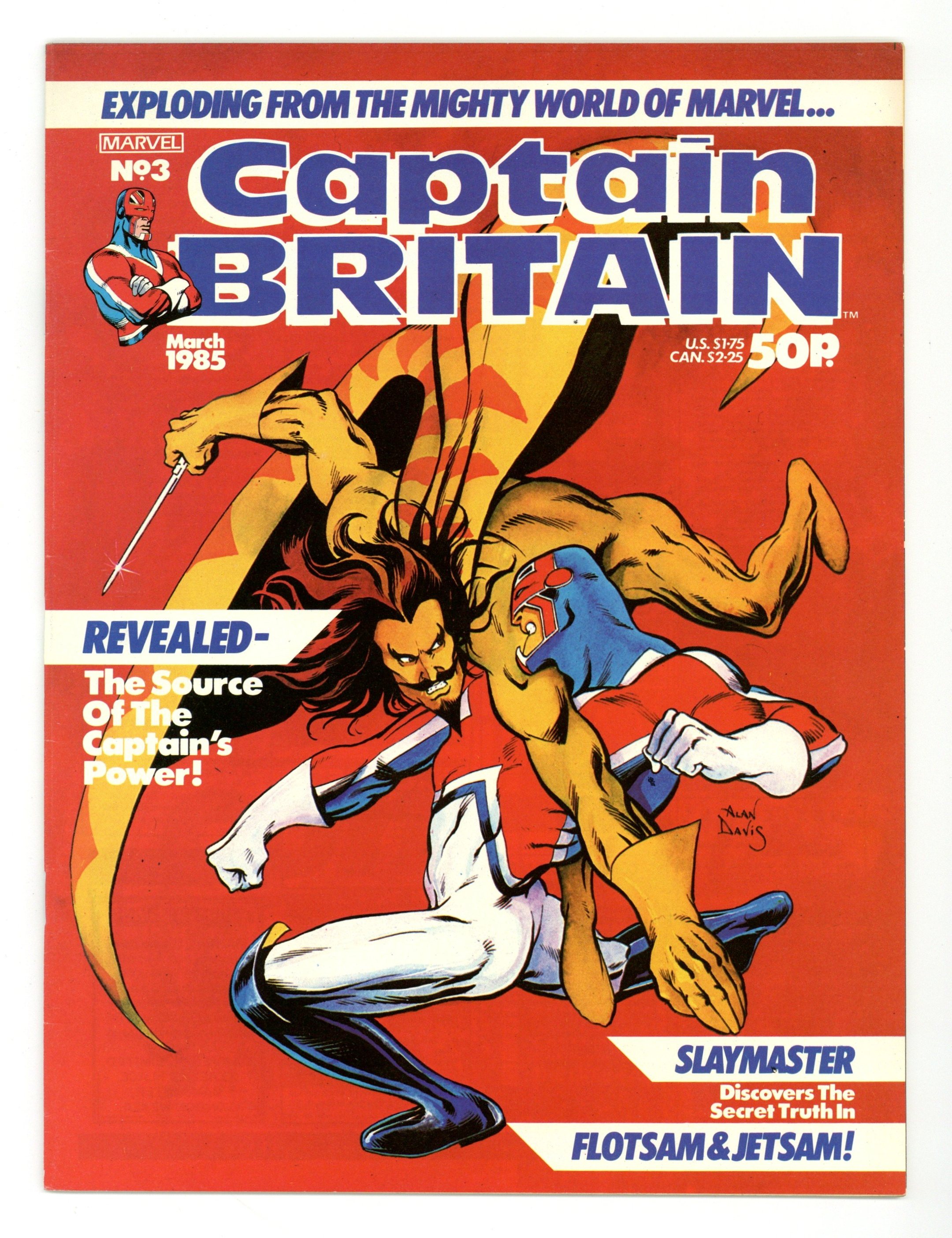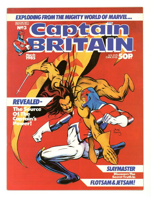 Captain Britain in "Flotsam And Jetsam" by Jamie Delano and Alan Davis; Paragon of Painthorpe Street by Steve Alan and Jeff Anderson; Night Raven by Steve Parkhouse and David Lloyd; Abslom Daak - Dalek Killer by Steve Moore and Steve Dillon; the Free-Fall Warriors in "Recruitment..." by Steve Parkhouse and Jerry Paris. Davis cover. Cover price $1.75.