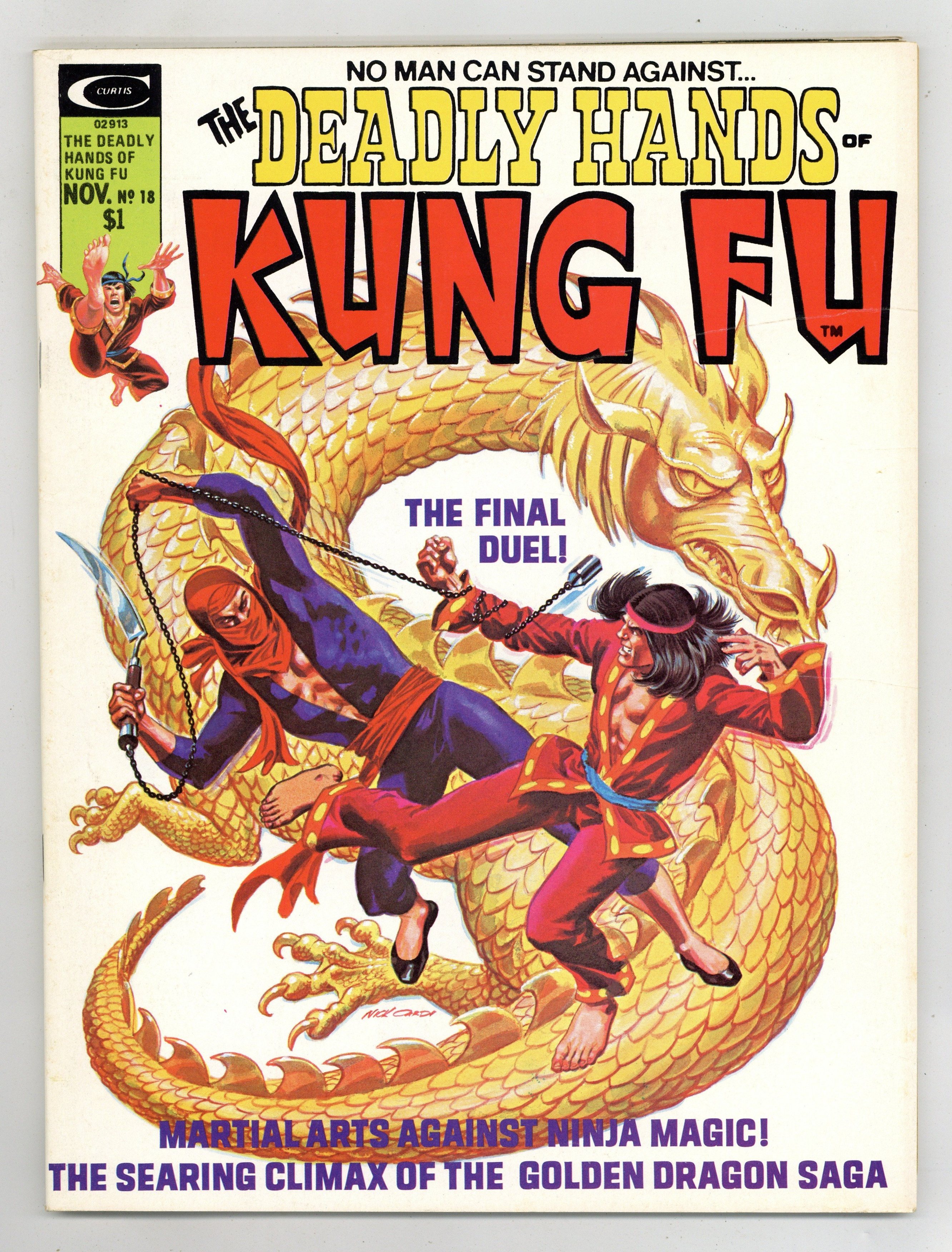Stan Lee Presents: The Deadly Hands of Kung Fu. Cover by Nick Cardy. Includes: "Enter the Letters!" A letters page with readers' thoughts on previous issues. "Re-Enter the Editor." An editorial by Archie Goodwin. Shang Chi, the Master of Kung Fu, stars in "Secret of the Dragon!" Story by Doug Moench. Art by Rudy Nebres. "The Yakuza a Sword to the Mind!" An article by Don McGregor. "Michi: Spirit of the Sword!" A photographed lesson in the use of the sword, text and photos by Valerie Eads. Iron Fist stars in "Fists of Darkness, Fists of Death!" Guest-starring the Sons of the Tiger. Story by Bill Mantlo. Art by Pat Broderick and Terry Austin. Black and white. Cover price $1.00.