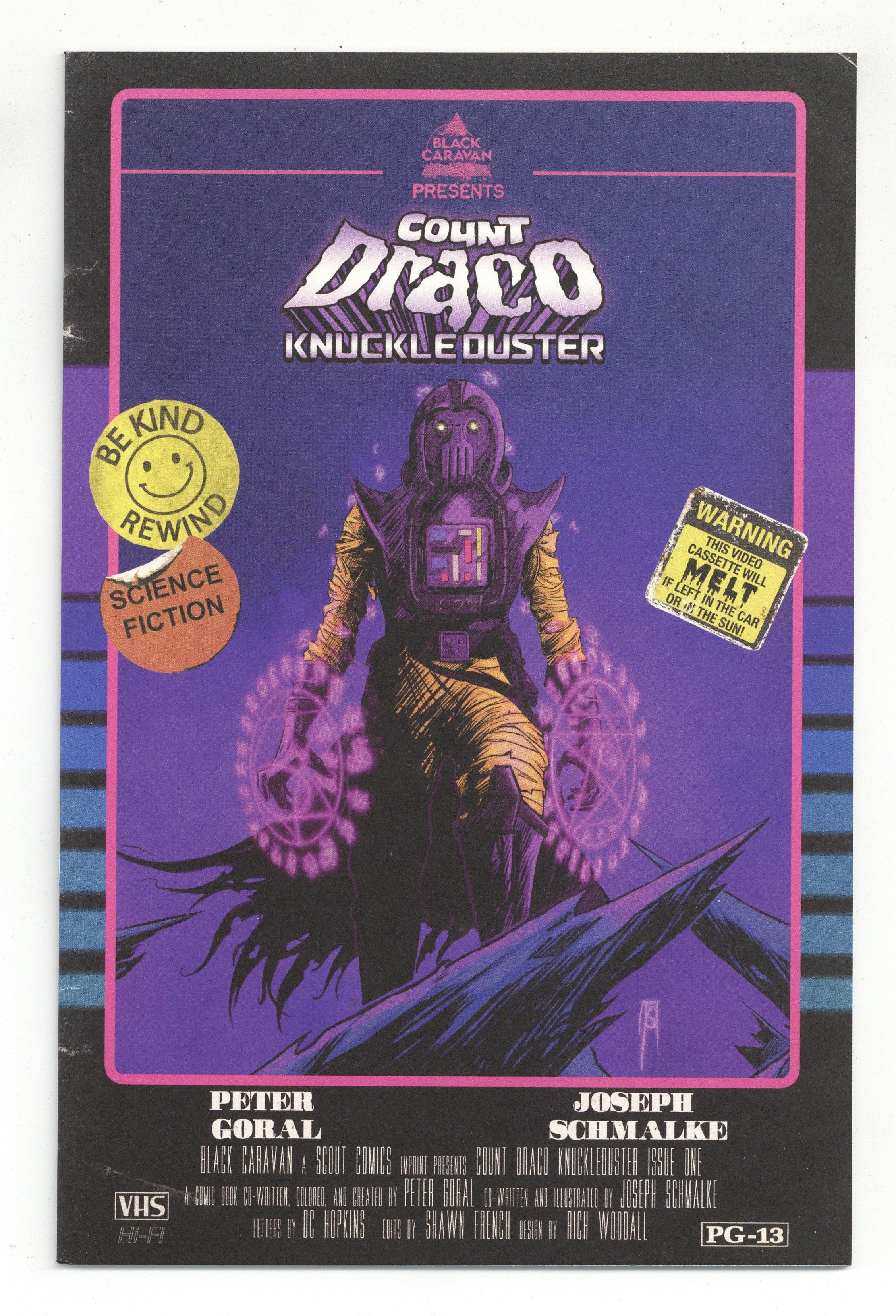Published Jul 2021 by Scout Comics.$3.00Written by Joseph Schmalke, Peter Goral. Art and Cover by Joseph Schmalke. Black Caravan Imprint: The Curse of the Cryptocrystalline Stone continues in 2021! Follow the Cosmic Ghoul Warrior and young psychic, Acele Aerglo, as they embark on the next chapter of an adventure that will take them from the vastness of The Void to the depths of an aquatic moon crawling with fantastic creatures! This action-packed tale of sinister celestial sorcery continues, this time told from behind the mask of the mysterious and malevolent Count Draco Knuckleduster and his Cybernetic Chrononautical Exosuit! Can the curse be broken in time... or is it already too late? 32 pages, full color. Cover price $3.99.