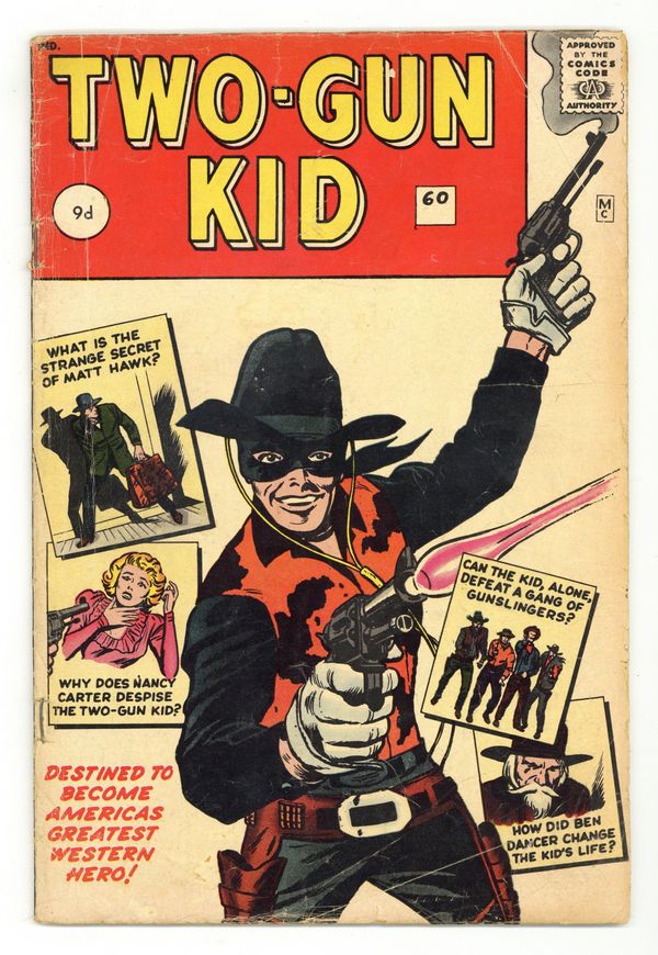 UK edition. Identical to US edition, but has 9d cover price. Cover pencils by Jack Kirby, inks by Dick Ayers. "The Beginning of the Two-Gun Kid," script by Stan Lee, pencils by Jack Kirby, inks by Dick Ayers; Matt Hawk arrives from the East; After helping Ben Dancer with two crooks, Ben teaches him all he knows and Matt becomes the Two-Gun Kid. "No Guns in Town" text story, art by Joe Maneely. "The Outcast," script by Stan Lee, art by Don Heck; Takawana schemes to remove Growling Bear and his son from power to become a Navaho Chief. "I Hate the Two-Gun Kid," script by Stan Lee, pencils by Jack Kirby, inks by Dick Ayers; Clem Carter and his gang rob Matt Hawk, taking money Nancy Carter had left with Matt. 36 pgs., full color.