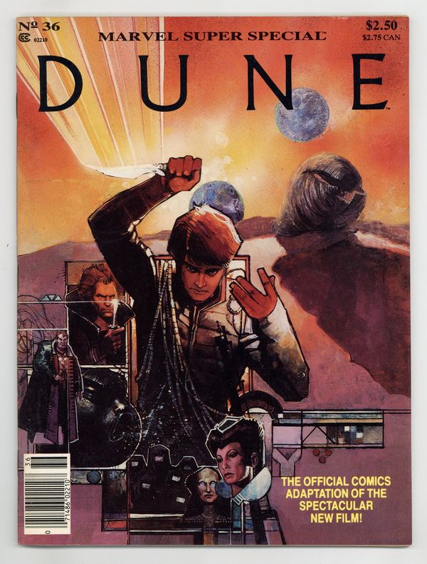 Dune. The official comic book adaptation of the David Lynch movie, based on Frank Herberts classic science fiction novel. In the far future, humanity adapts to life on a desert planet. Written by Ralph Macchio, with art by Bill Sienkiewicz. Story later reprinted in Dune #1-3. To date, the only comic book version of the Dune saga. Painted cover by Sienkiewicz. Full color; 68 pages. Cover price $2.50.