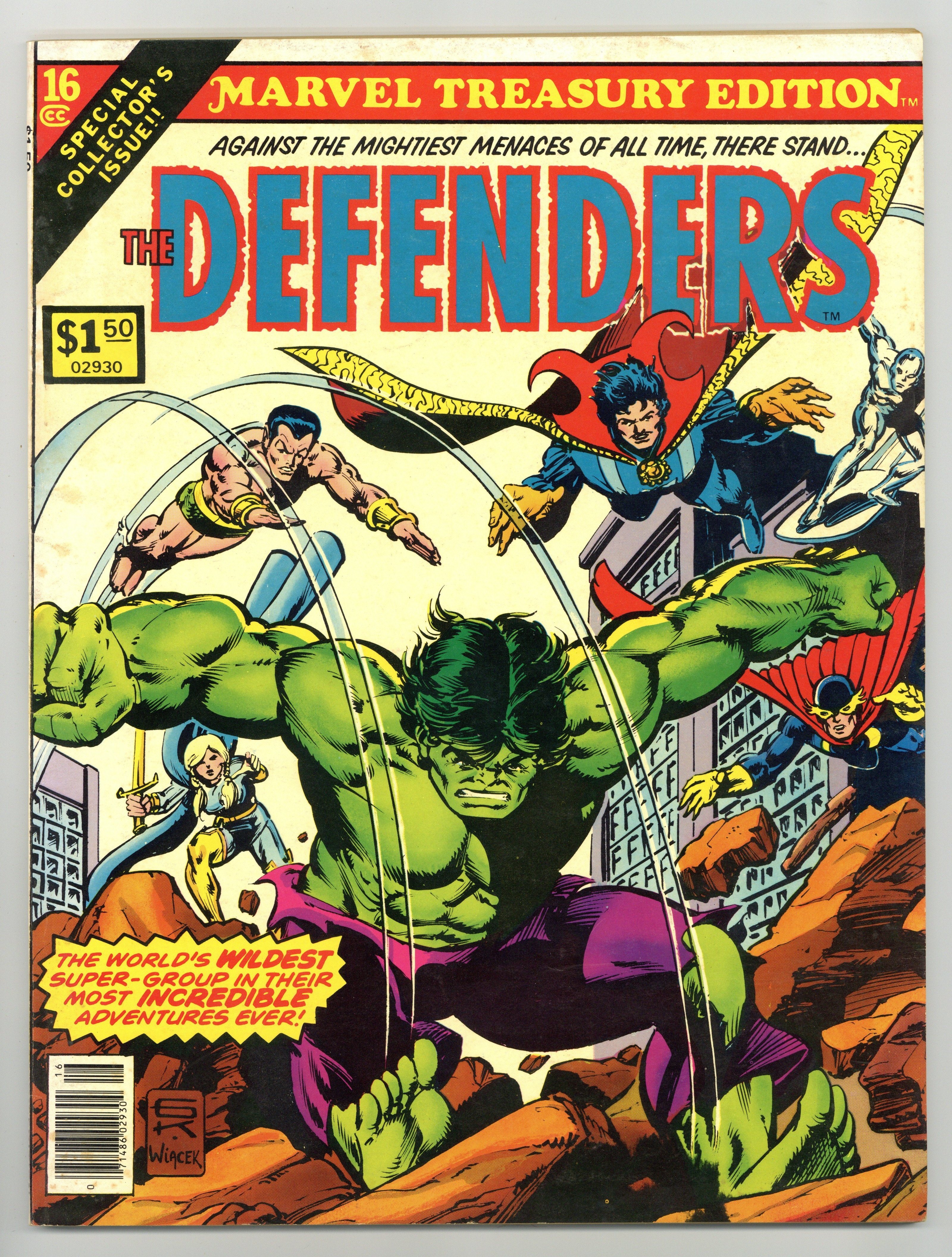 Marvel Treasury Edition (1974) #16 features the Defenders (Dr. Strange, Hulk, Sub-Mariner, Silver Surfer, Valkyrie, Nighthawk, and Hellcat) against the mightiest menaces of all time. This issue features "The Day of the Defenders" (Reprints Marvel Feature #1) by Roy Thomas, Ross Andru, and Bill Everett, "The New Defenders" (Reprints Defenders #4) by Steve Englehart, Sal Buscema, and Frank McLaughlin, "For Sale: One Planet, Slightly Used" (Reprints Defenders #13-14) Defenders vs. Squadron Sinister (evil Squadron Supreme) by Len Wein, Sal Buscema, Klaus Janson, and Dan Green. Guest-starring the Black Knight. Moon Knight cameo. Featuring the villainy of Nebulon, the Enchantress, Skurge the Executioner, and Squadron Sinister. 84 pages, FC. Cover price $1.50.