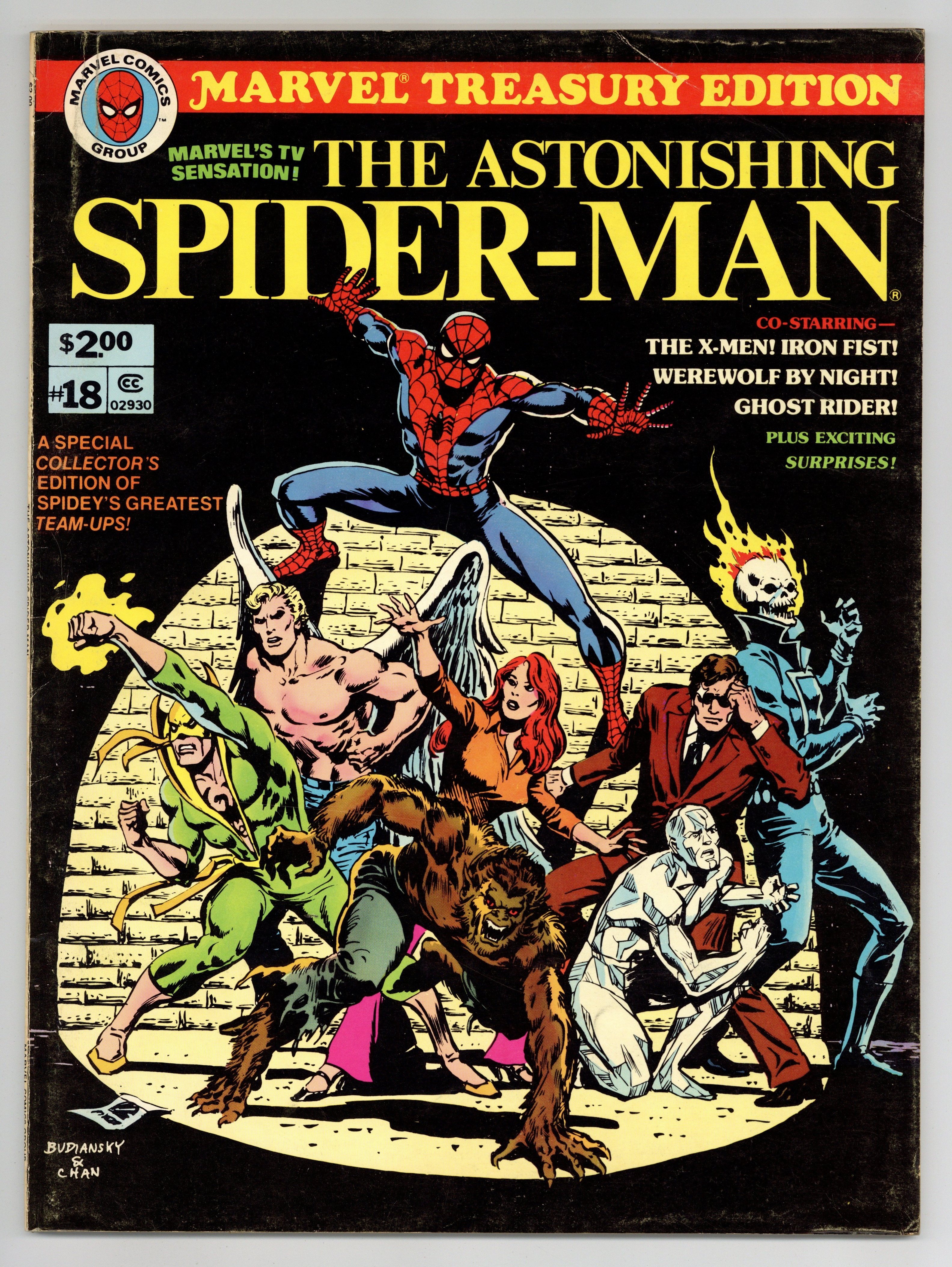 Marvel Edition. Marvel Treasury Edition (1974) #18 features Marvel's TV sensation the Astonishing Spider-Man. This issue features some of Spidey's greatest team-ups including "And then, the X-Men" (Reprints Marvel Team-Up #4) by Gerry Conway, Gil Kane, and Steve Mitchell, "Wolf at Bay" (Reprints Marvel Team-Up #12) by Len Wein, Gerry Conway, Ross Andru, and Don Perlin, "If an Eye Offend thee..." (Reprints Marvel Team-Up #15) by Len Wein, Ross Andru, and Don Perlin, "For a Few Fists More" (Reprints Marvel Team-Up #31) by Gerry Conway, Jim Mooney, and Vince Colletta. Guest-starring the original X-Men, Werewolf by Night, Ghost Rider, and Iron Fist and featuring the villainy of Morbius the Living Vampire and the Orb. 80 pages. Cover price $2.00.