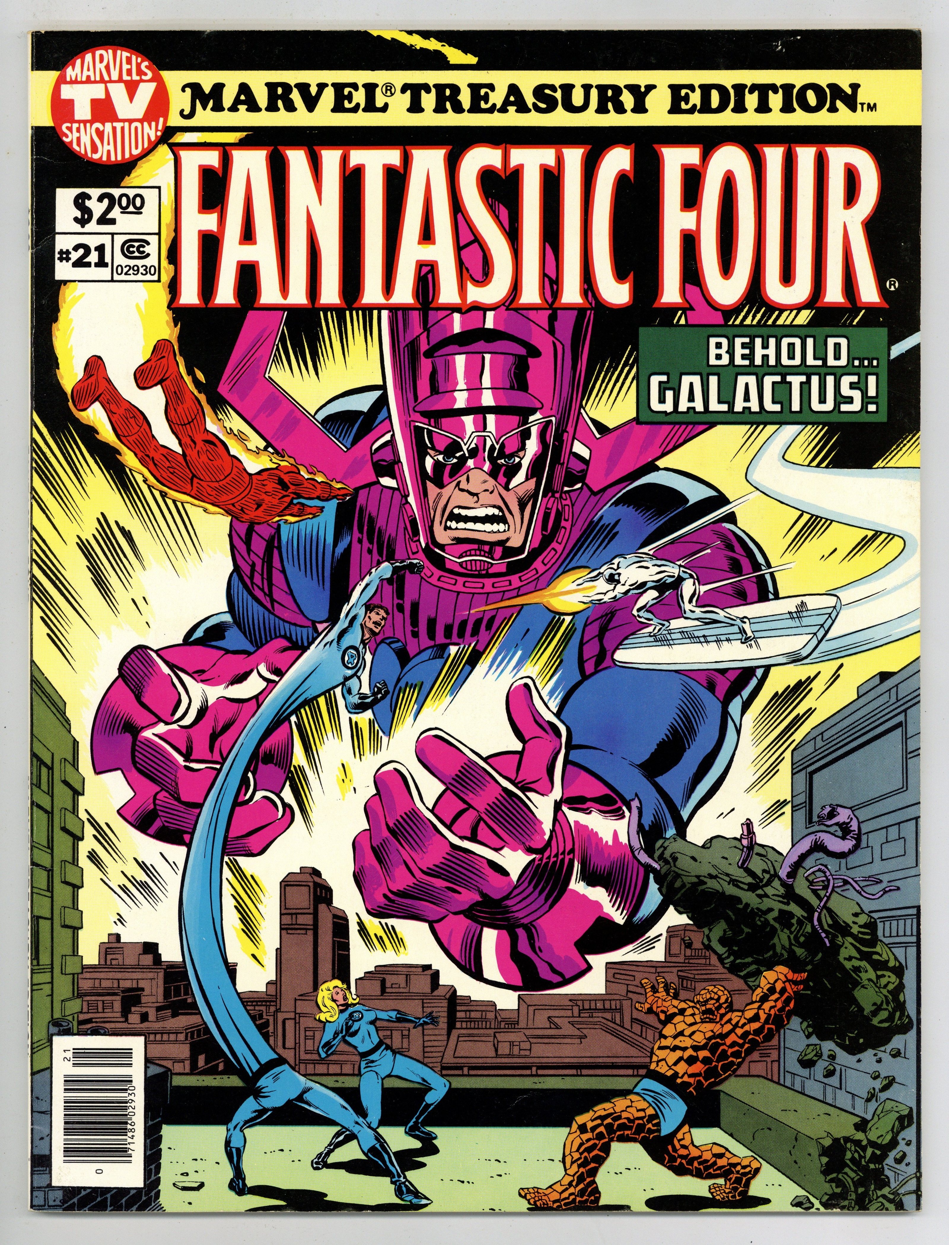 $74.00Marvel Treasury Edition (1974) #21 features the Fantastic Four. This issue includes one of the most epic FF tales as they must defend the planet against the World Devouring Galactus and his new herald Air-Walker. Reprints Fantastic Four #120-123. "The Horror that Walks on Air" by Stan Lee, John Buscema, and Joe Sinnott. Guest-starring the Silver Surfer. 80 pages. Cover price $2.00.
