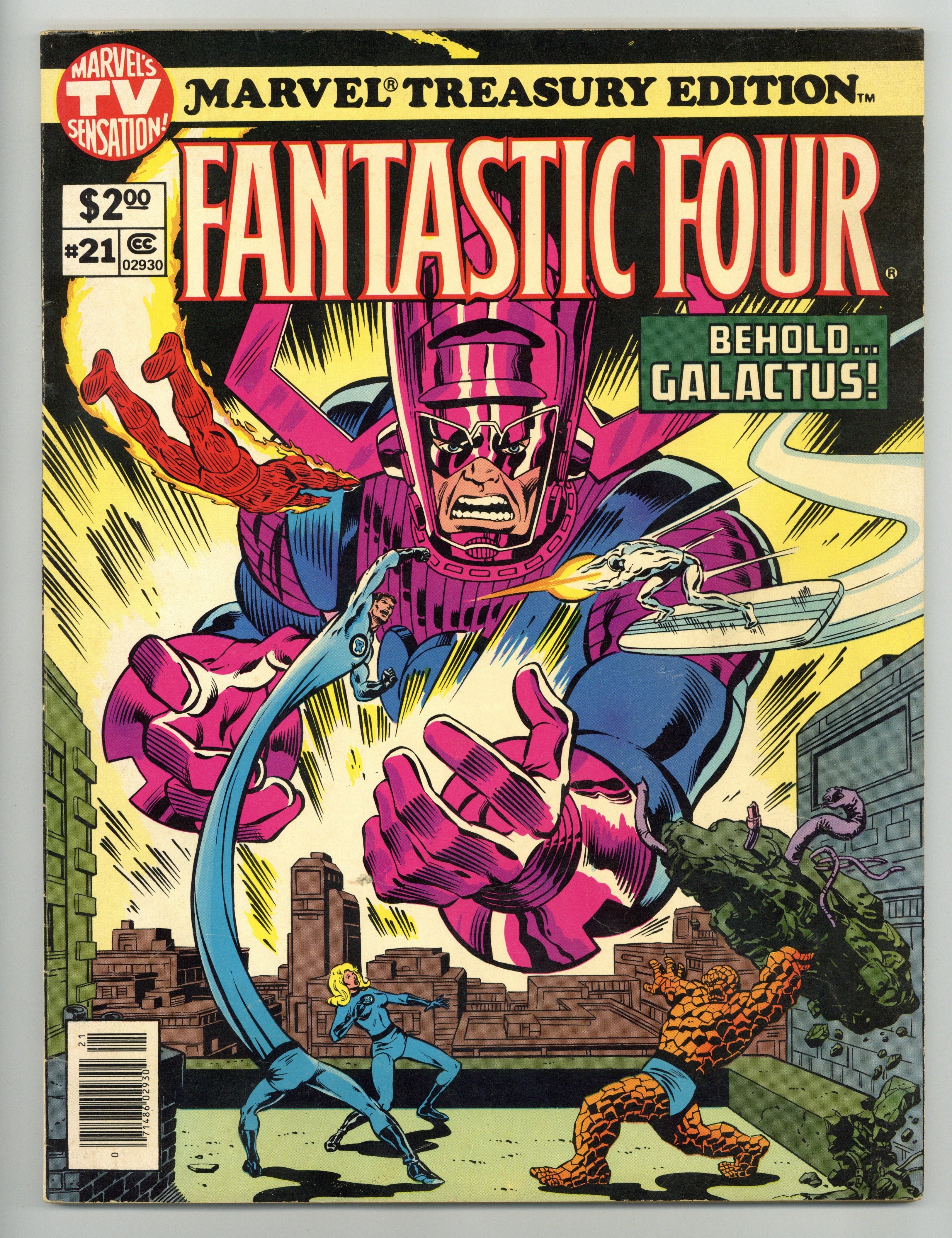 Marvel Treasury Edition (1974) #21 features the Fantastic Four. This issue includes one of the most epic FF tales as they must defend the planet against the World Devouring Galactus and his new herald Air-Walker. Reprints Fantastic Four #120-123. "The Horror that Walks on Air" by Stan Lee, John Buscema, and Joe Sinnott. Guest-starring the Silver Surfer. 80 pages. Cover price $2.00.