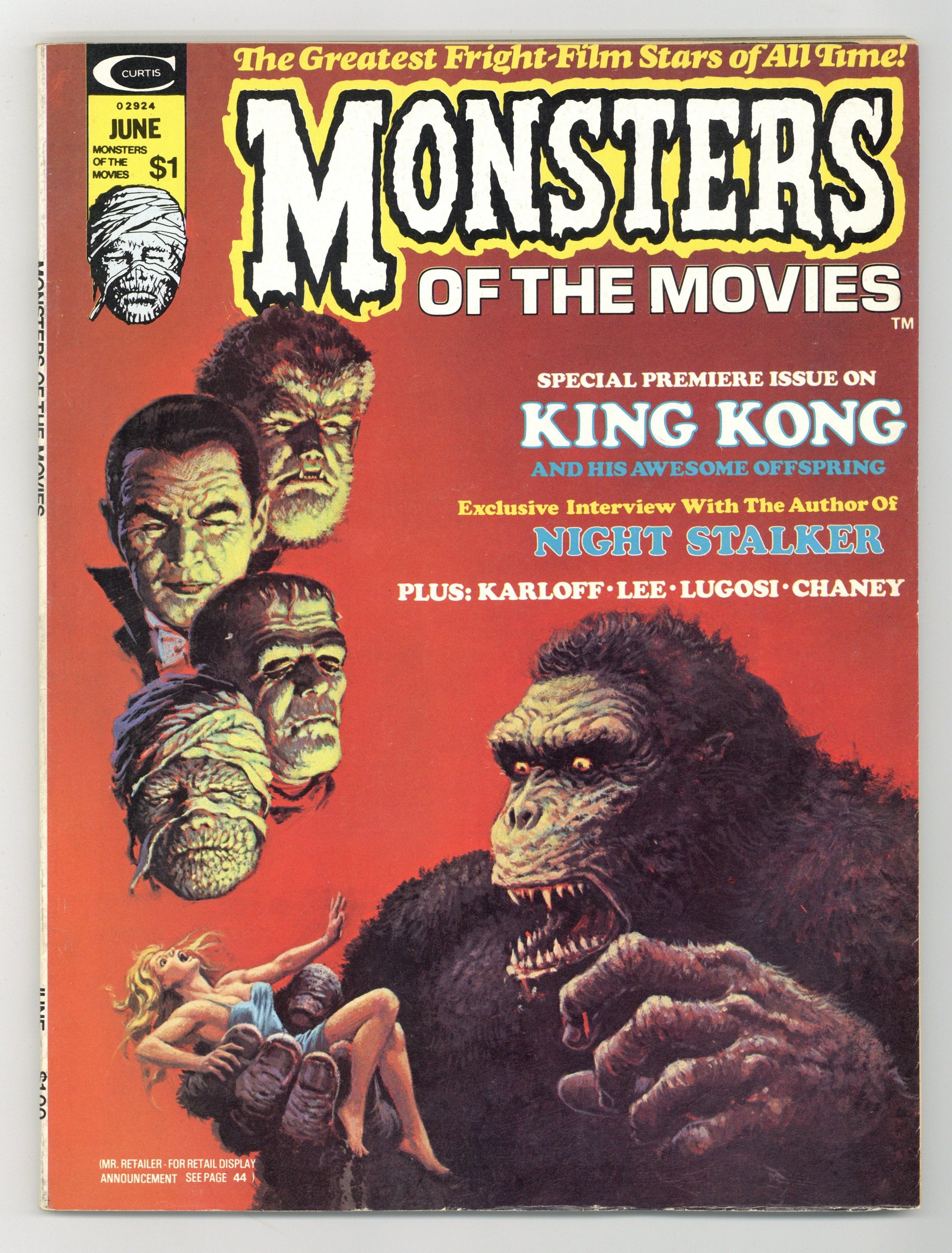 Stories and art by Stan Lee, Roy Thomas, Barry Windsor-Smith, Dan Adkins, Marv Wolfman, Don McGregor, Doug Moench, Chris Claremont and Tony Isabella. Marvel's attempt at a Famous Monsters-type magazine featured many Marvel legends early in their careers. Interviews with Frankenstein actor Boris Karloff and Jeff Rice, creator of Kolchak: The Night Stalker. Features about King Kong and horror on the radio. In an original comics story, horror-movie star Jason Roland makes a deal with a strange little man in exchange for fame. Movie stills from vintage horror movies with humorous word balloons added. Monsters of the Marvels; King Kong: Monarch of Monsters; The Night Stalker Papers; Horrorscoop; The Demon That Devoured Hollywood!; Out of the Mouths of Ghouls; Monsterscope; Karloff at the Raven's Castle; Monsters of the Radio. 8 1/2-in. x 11-in., 80 pages, B&W. Cover price $1.00.