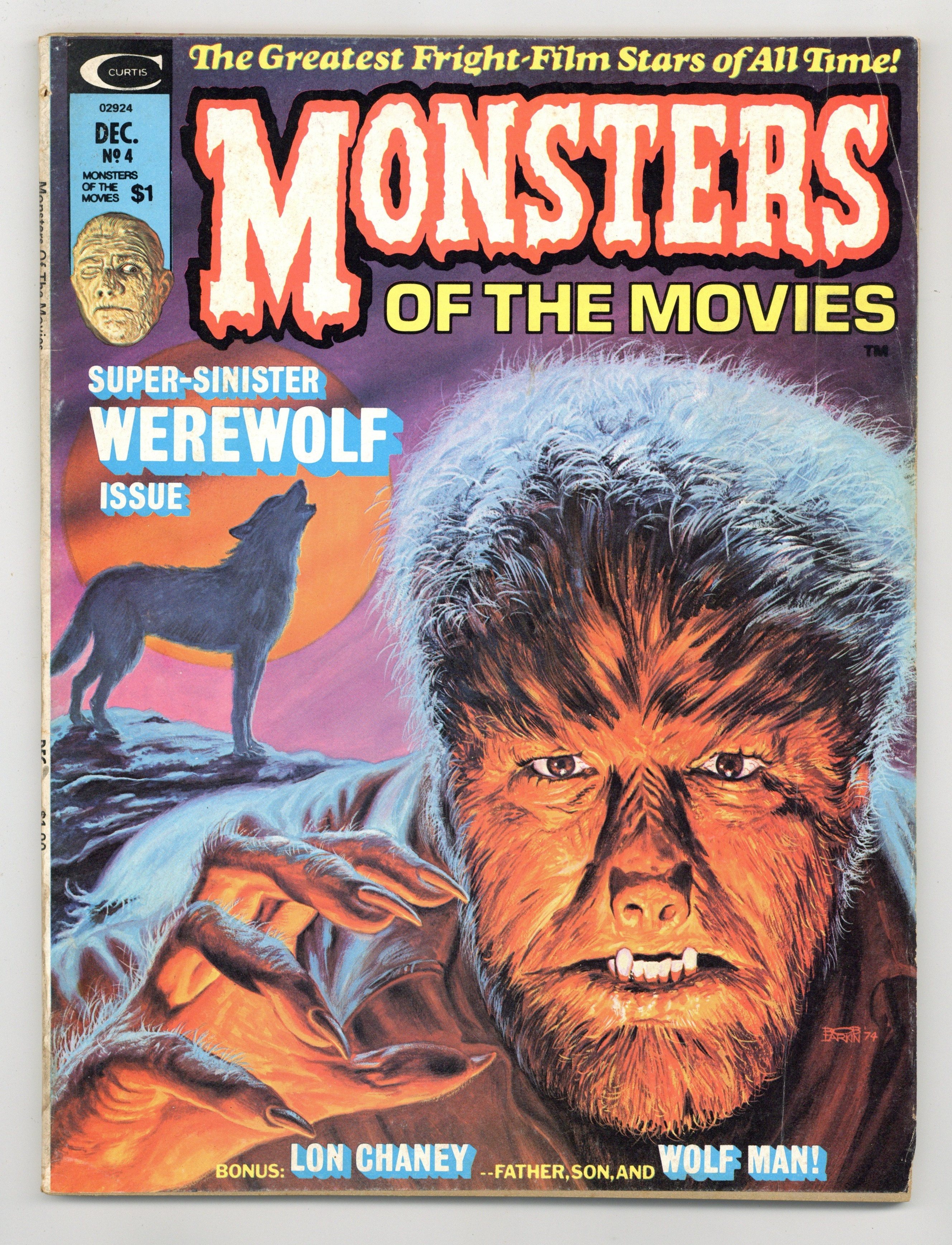 Cover by Bob Larkin. Stories and art by Mike Royer and Jim Harmon. Marvel's attempt at a Famous Monsters-type magazine featured many Marvel legends early in their careers and great painted covers. A profile of pioneering horror star Lon Chaney Sr. The history of monster make-up in the movies. Werewolf and vampire legends. In an original comics story, detectives become involved with a horror-movie star and his deranged daughter while investigating a murder. Beware the Bat People!; Werewolves: Part-Time Monsters; From Schlock to Exorcist; The Wolf Man of Spain; Lon Chaney Sr.: Sire to a Dynasty of Terror; Monsterscope; Bello Ordloff Is a Monster! 8 1/2-in. x 11-in., 80 pages, B&W. Cover price $1.00.