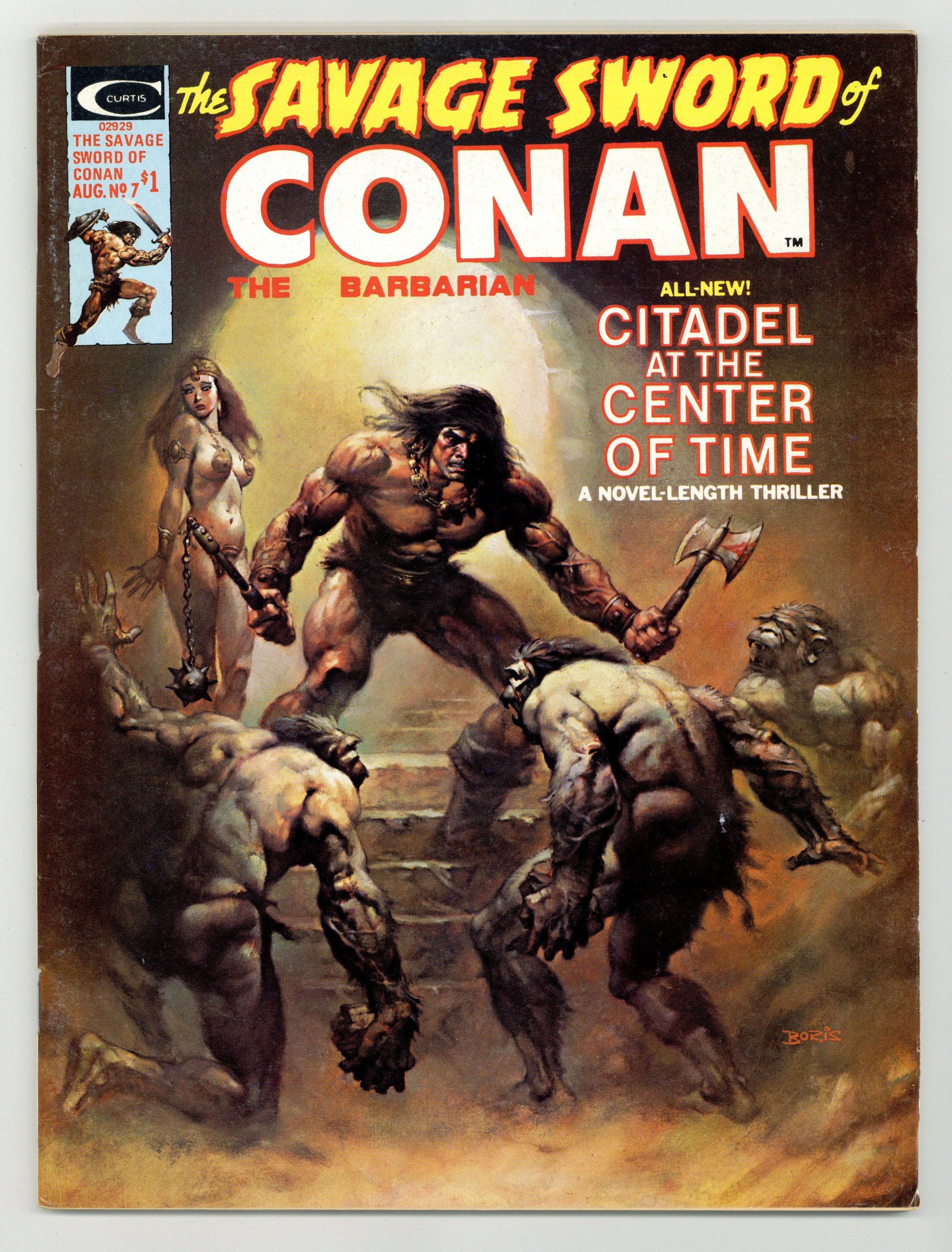 $18.75Conan stars in "The Citadel at the End of Time" Written by Roy Thomas. Pencils by John Buscema. Inks by Alfredo Alcala; "The Hyborian Age Chapter 1: The Pre-Cataclysmic Age" Written by Thomas. Art by Walt Simonson. King Kull cameo. Adapted from the essay by Robert E. Howard; "Lines Written in the Realization That I Must Die." Poem by Howard. Art by Barry Windsor-Smith; "The Gods Of The Hyborian Age Part 2: Crom and Mitra: Gods to Swear By" Article by Robert L. Yaple with illustrations by Mike Vosburg and Buscema/Alcala. Details about the gods of Conan's world; "Chronicles Of The Sword Part 4: The King is Dead" Article by Lin Carter with a full-page illustration by Gray Morrow. An informal history of sword and sorcery fiction. Vicente Alcazar frontispiece. Boris Vallejo cover. Cover price $1.00.