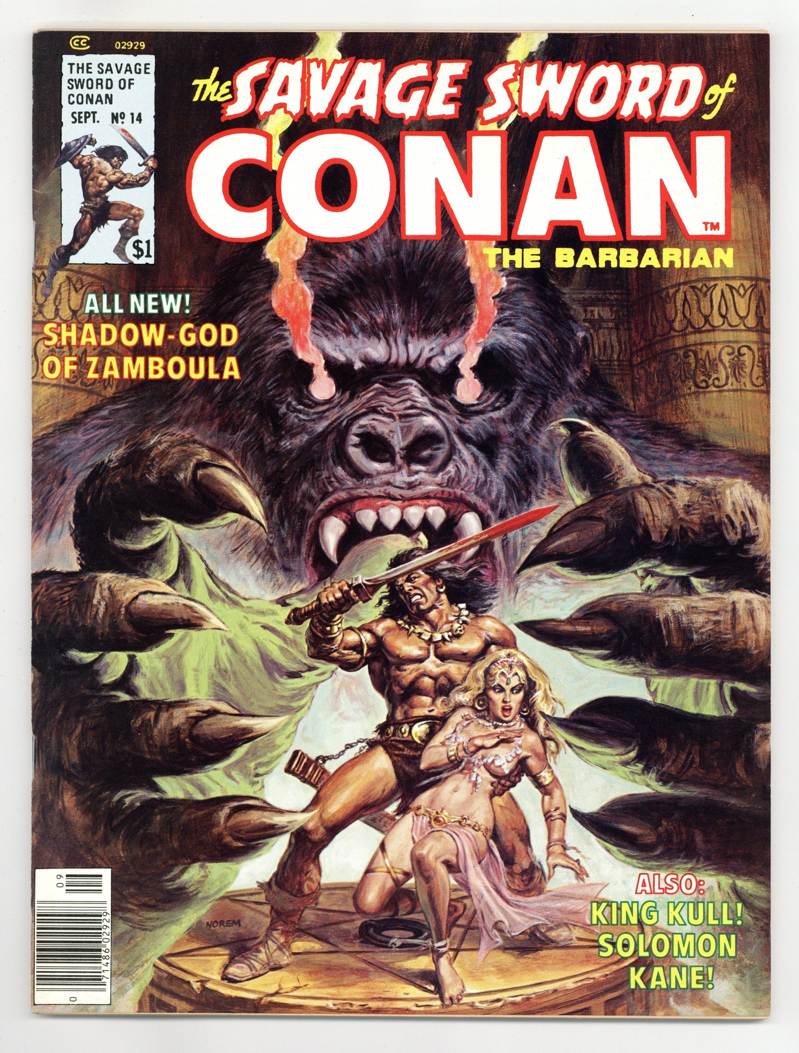 $70.00Conan stars in "Shadows in Zamboula." Script by Roy Thomas, pencils by Neal Adams and Tony Dezuniga, inks by Adams and the Tribe (DeZuniga and others). Adapted from the story by Robert E. Howard. Solomon Kane stars in "The Silver Beast Beyond Torkertown." Script by Doug Moench, art by Mike Zeck. Illustration by David Wenzel/Duffy Vohland. Fred Blosser reviews "The Worms of the Earth" hardcover book in "The Worms Return" with art by David Ireland. "A Kull Glossary" by Blosser with art by Michael Whelan, Michael Kaluta, and Al Milgrom. Frank Brunner frontispiece. Earl Norem cover. Cover price $1.00.