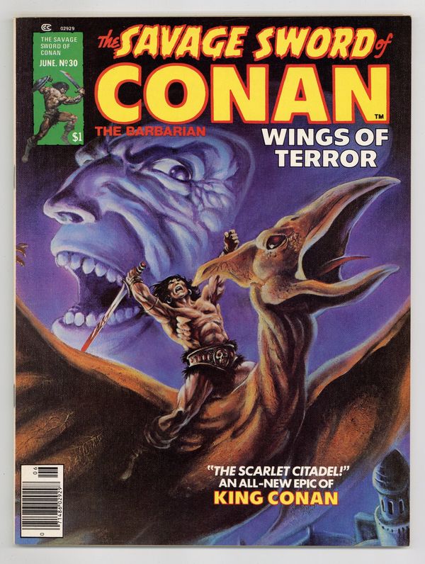 $19.50Conan stars in "The Scarlet Citadel." Script by Roy Thomas, art by Frank Brunner. Adapted from the story by Robert E. Howard. Bran Mak Morn portfolio by Brunner (reprinting the Middle Earth edition). "A Gazetteer of the Hyborian World of Conan" by Lee Falconer (from the book by Starmont House). Illustrations by Alfredo Alcala, Bob Gould/Duffy Vohland, John Buscema/Bill Wray, and Val Mayerik. Letter to the editor from comic writer John Ostrander. Brunner cover. Cover price $1.00.