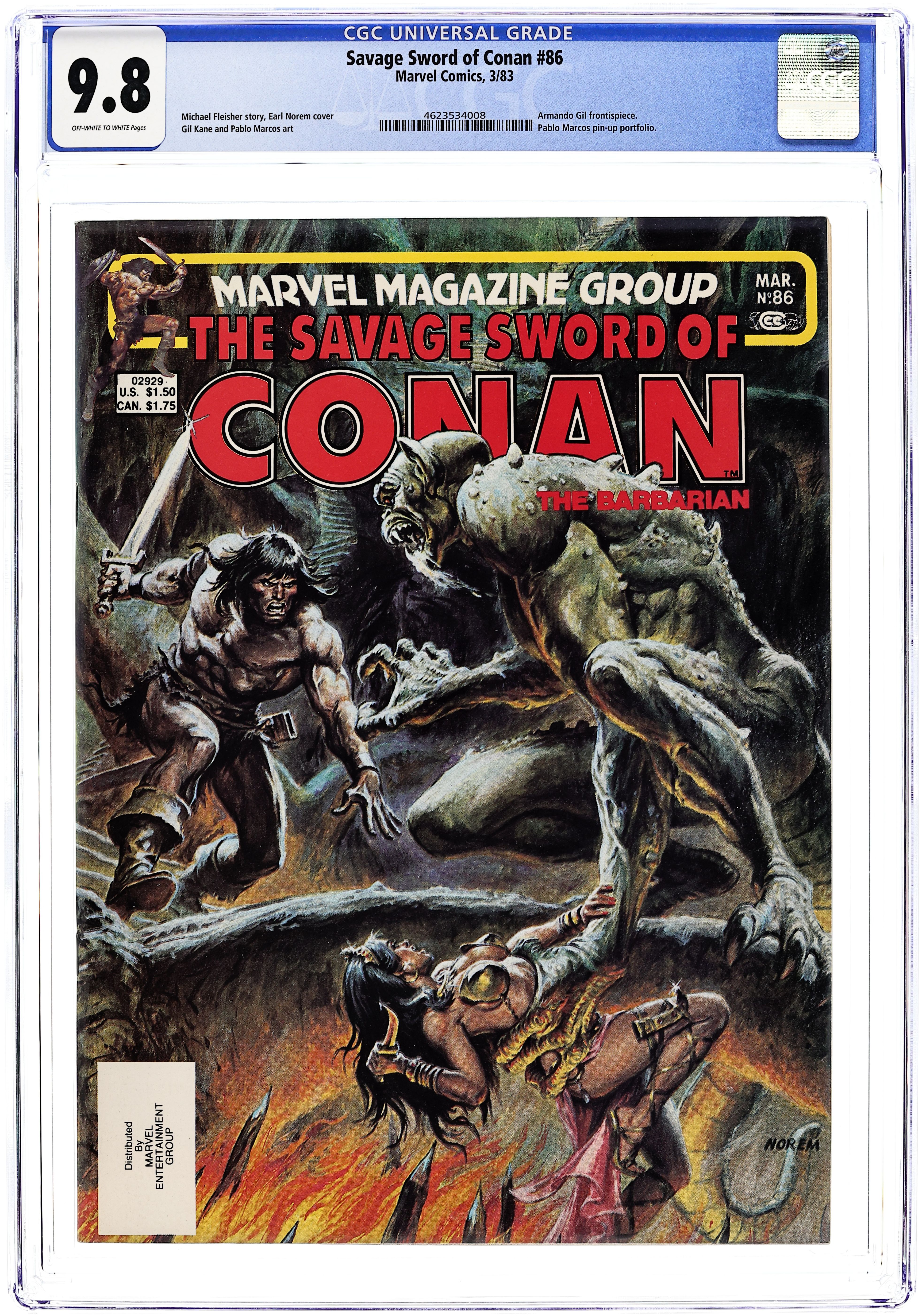 Conan stars in "Revenge of the Sorcerer." Script by Michael Fleisher, breakdowns by Gil Kane, additional pencils by Luke McDonnell, finished art by Zoran Vanjaka. "Lion of the Waves." Poem by Alan Zelenetz, art (six full-page illustrations) by Pablo Marcos. Belit appearance. Statement of ownership--average print run 204,278; average paid circulation 125,307. Earl Norem cover. Cover price $1.50.