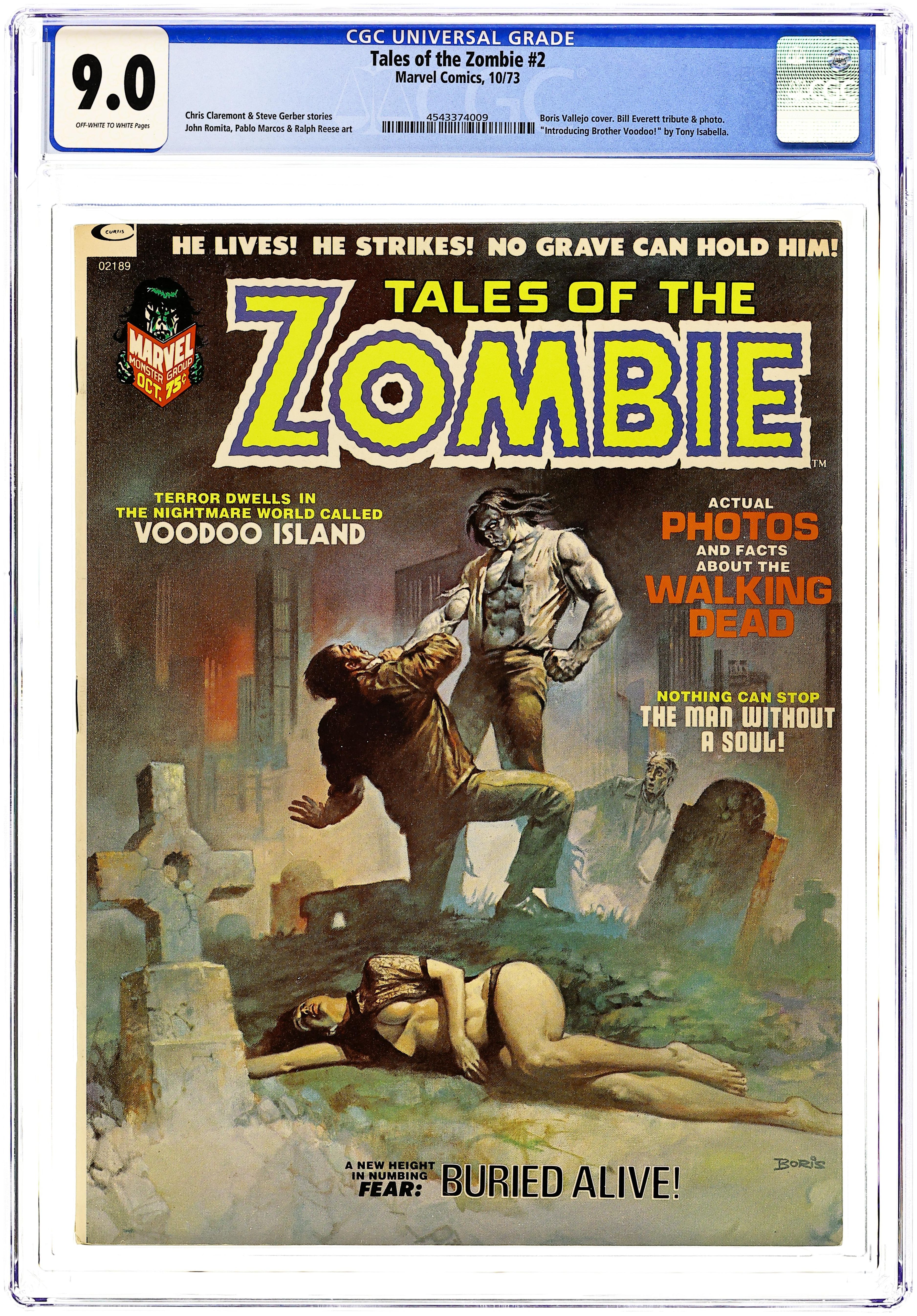 Simon Garth dies but is brought back to life as a zombie and doomed to walk the earth as one of the living dead. In "Voodoo Island" and "Night of the Spider," Garth's daughter travels to an island hoping to solve the mystery of his disappearance and her father, as the zombie, follows. Script by Steve Gerber and art by Pablo Marcos. Issue also has "Voodoo Unto Others" (Script by Tony Isabella and art by Winslow Mortimer), "Acid Test" (Script by Stan Lee and art by George Tuska), an article about Brother Voodoo ("Marvel's most mysterious superhero"), "Twin Burial" (Script by Chuck Robinson and art by Ralph Reese), "From Out of the Grave" (Script by Stan Lee and art by Gene Colan), and an article about voodoo. All stories are in black and white. Cover price $0.75.