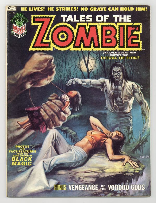 Starts Apr 20 Simon Garth dies but is brought back to life as a zombie and doomed to walk the earth as one of the living dead. In "When the Gods Crave Flesh," the zombie has to intervene when a movie maker tries to film a voodoo cult. Script by Steve Gerber and art by Pablo Marcos. Issue also has "With the Dawn Comes…Death" (Story by Chris Claremont), "Net Result" (Story and art credits unknown), "Warrior's Burden" (Script by Tony Isabella and art by Vicente Alcazar), an article on the movie "Night of the Living Dead," "I Won't Stay Dead" (Art by Bill Walton), and "Jilimbi's Word" (Script by Doug Moench and art by Enrique Badia). All stories are in black and white. Cover price $0.75.