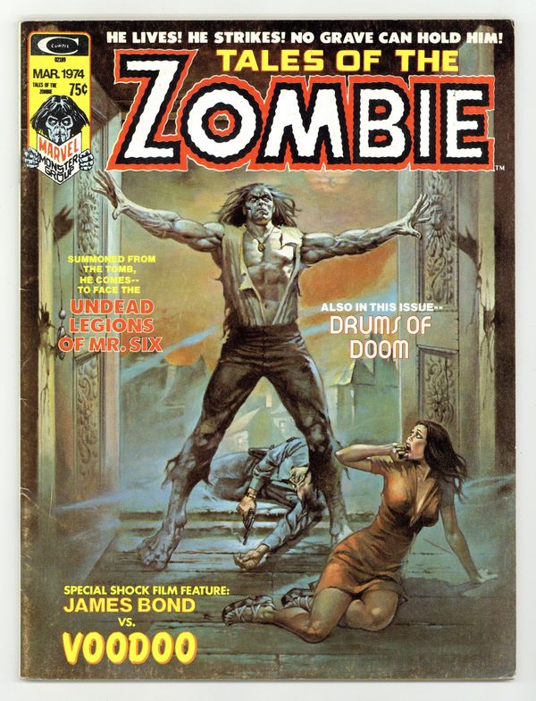 Simon Garth dies but is brought back to life as a zombie and doomed to walk the earth as one of the living dead. In "The Law and Phillip Bliss" and "Dead Man's Judgment," the Amulet of Damballah calls Simon Garth back to New Orleans for a devastating day in court. Script by Steve Gerber and art by Pablo Marcos. Issue also has "James Bond Meets Baron Samedi or Live and Let Die Revisted" (an article about the movie by Don McGregor), "The Drums of Doom" (Script by Gerry Conway and art by Rich Buckler, Vic Martin and Win Mortimer), an article about witchcraft by Lin Carter, "Courtship By Voodoo" (Script by Tony Isabella and art by Ron Wilson), "Nightfilth Rising" (Script by Doug Moench and art by Win Mortimer), and "Four Daughters of Satan" (Script by John Albano and art by Ernie Chua). All stories are in black and white. V2#1 in indicia, March 1974 on cover. Cover price $0.75.
