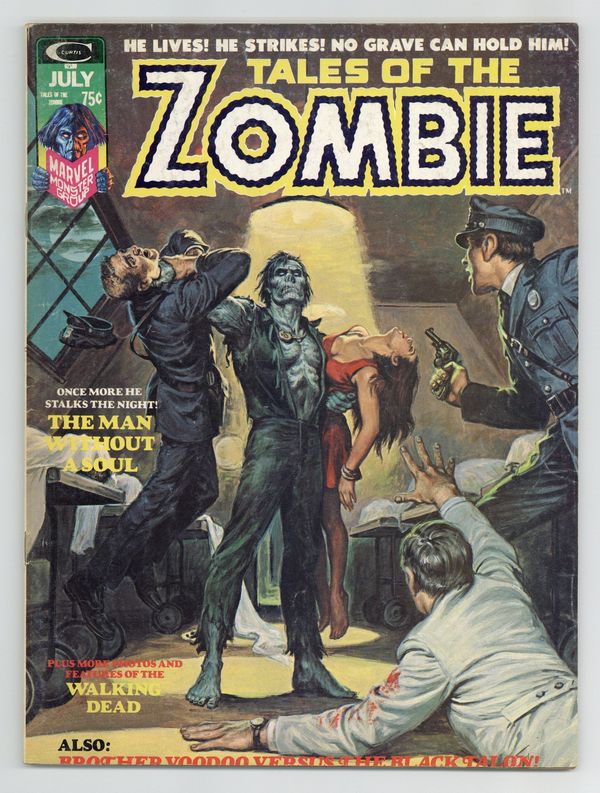$15.00Simon Garth dies but is brought back to life as a zombie and doomed to walk the earth as one of the living dead. In "Child of Darkness," the voodoo priestess Layla tries to help the zombie but leads him to a deadly foe. Script by Steve Gerber and art by Pablos Marcos. Issue also has "The Plague of the Zombies" (Story by Gerry Boudreau), an article about the movie "Sugar Hill," "The Complete Voodoo Man" (Article by Chris Claremont), "End of a Legend" (Script by Doug Moench and Len Wein and art by Gene Colan and Frank Chiaramonte), and "The Voodoo Beat" (Article by Carla Joseph). All stories are in black and white. Cover price $0.75.