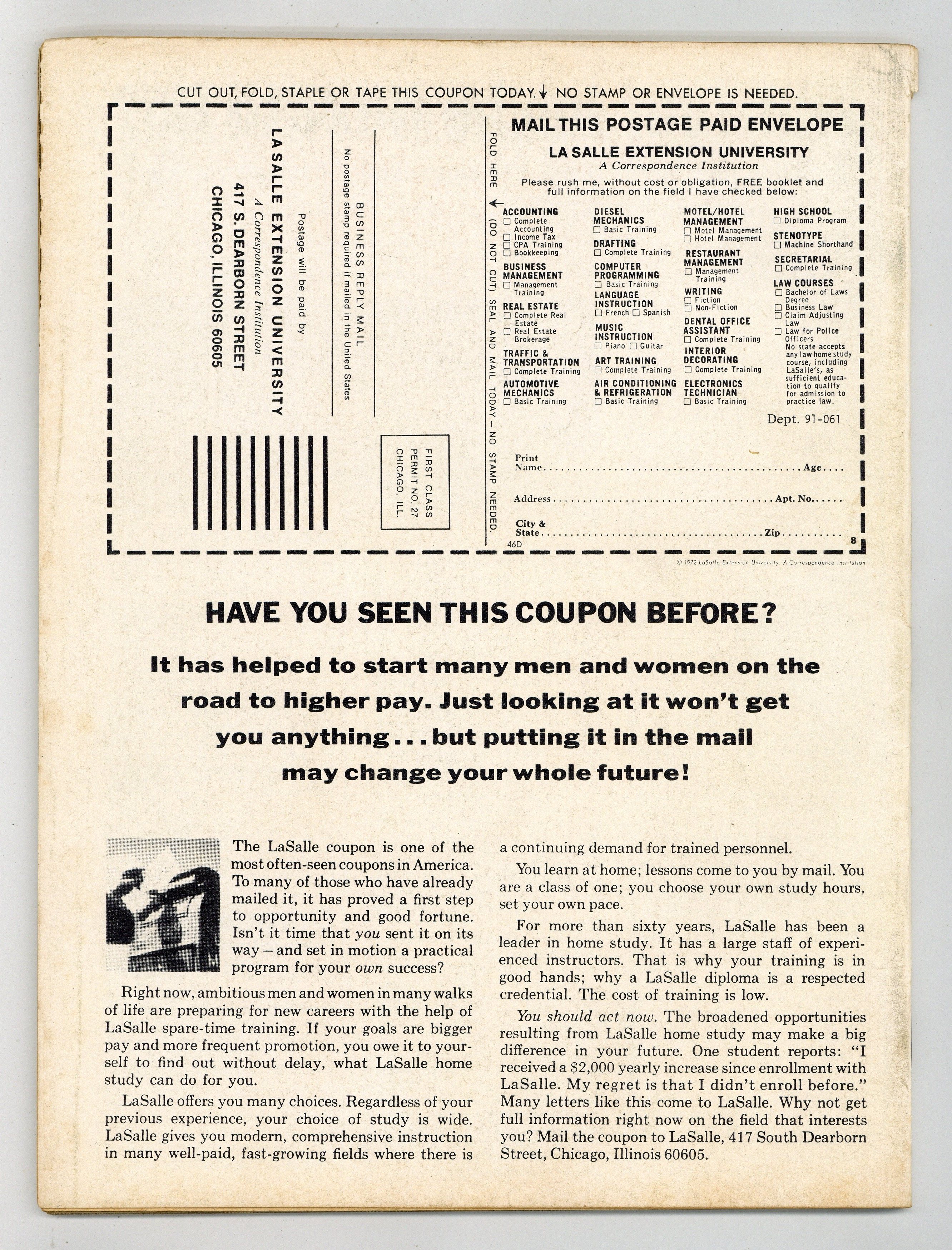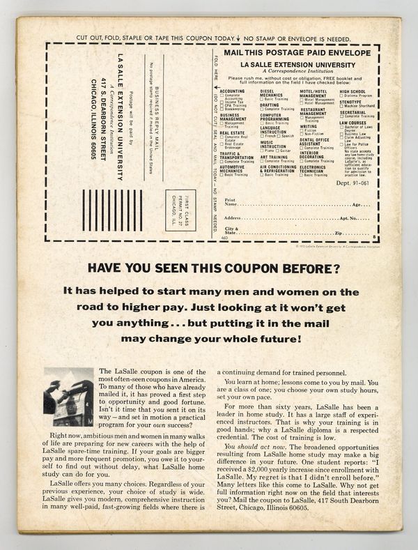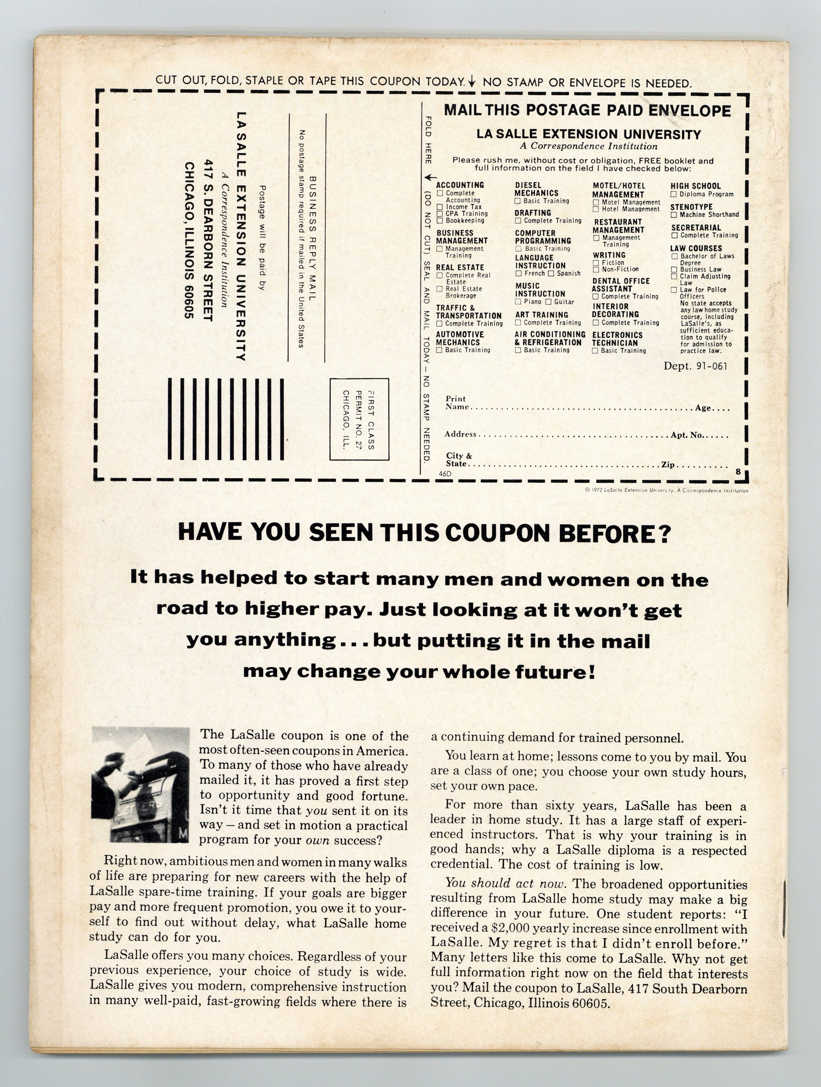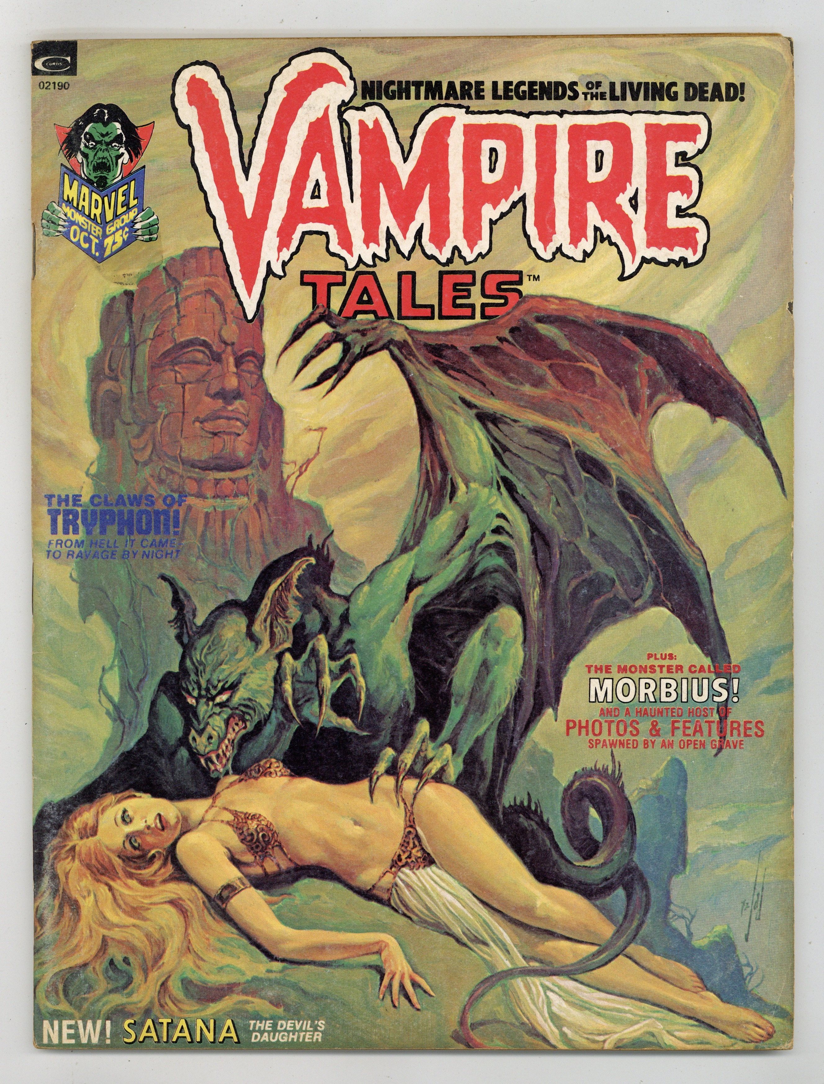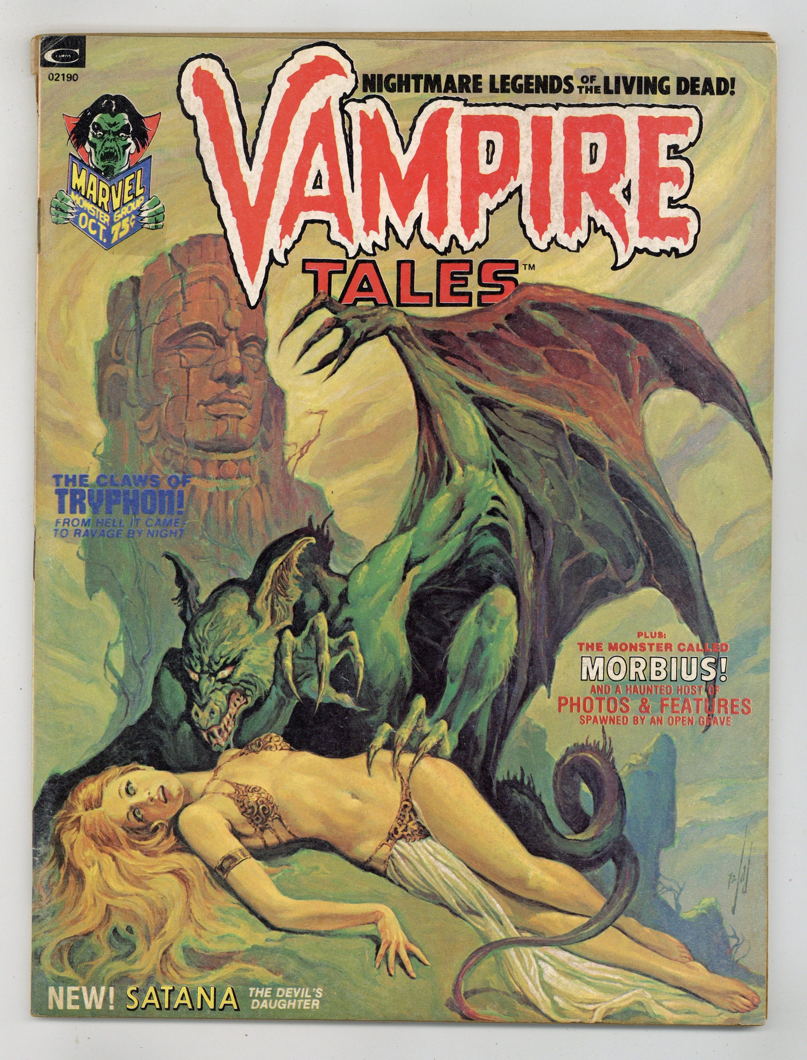 Morbius finds himself rescuing a young woman when she's nabbed by a mysterious coven in "The Blood Sacrifice of Amanda Saint" (Story by Don McGregor, art by Rich Buckler and Pablo Marcos). In 1600s Salem, Massachusetts a young woman tries to escape a bloodthirsty mob after she's wrongfully accused of being a witch in "Witch Hunt!" (Story credits: unknown, art by Mannie Banks). An article about Bela Lugosi's other vampire roles aside from Dracula by Doug Moench. An adventurer named Simon Majors enters another dimension that serves a powerful being in "Five Claws to Tryphon" (Story by Gardner Fox, art by Jesus Blasco and John Romita). Article by Chris Claremont. First appearance of Satana, the Devil's Daughter in "Satana" (Produced by Roy Thomas and John Romita). Lou and Marie Fowler search for a secret fortune in a creepy house once owned by Lou's late uncle, but they get more than they bargained for in "At the Stroke of Midnight" (Story and art by Jim Steranko). Hodiah Twist investigates the death of a man who's been killed by vampires in "The Praying Mantis Principle" (Story by Don McGregor, art by Rick Buckler). JAD painted cover. Black and white, 74 pages. 75 cent cover price. Cover price $0.75.