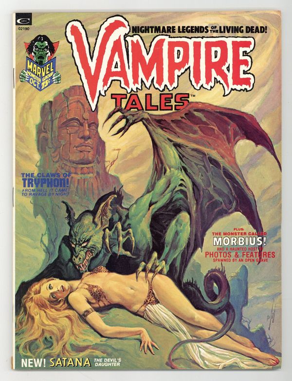 Ends Jan 26 9:58 PM CST Bid History 5 bids Current Bid $12 Your Secret Max Bid If you'd like to bid, please log in or register. Morbius finds himself rescuing a young woman when she's nabbed by a mysterious coven in "The Blood Sacrifice of Amanda Saint" (Story by Don McGregor, art by Rich Buckler and Pablo Marcos). In 1600s Salem, Massachusetts a young woman tries to escape a bloodthirsty mob after she's wrongfully accused of being a witch in "Witch Hunt!" (Story credits: unknown, art by Mannie Banks). An article about Bela Lugosi's other vampire roles aside from Dracula by Doug Moench. An adventurer named Simon Majors enters another dimension that serves a powerful being in "Five Claws to Tryphon" (Story by Gardner Fox, art by Jesus Blasco and John Romita). Article by Chris Claremont. First appearance of Satana, the Devil's Daughter in "Satana" (Produced by Roy Thomas and John Romita). Lou and Marie Fowler search for a secret fortune in a creepy house once owned by Lou's late uncle, but they get more than they bargained for in "At the Stroke of Midnight" (Story and art by Jim Steranko). Hodiah Twist investigates the death of a man who's been killed by vampires in "The Praying Mantis Principle" (Story by Don McGregor, art by Rick Buckler). JAD painted cover. Black and white, 74 pages. 75 cent cover price. Cover price $0.75.