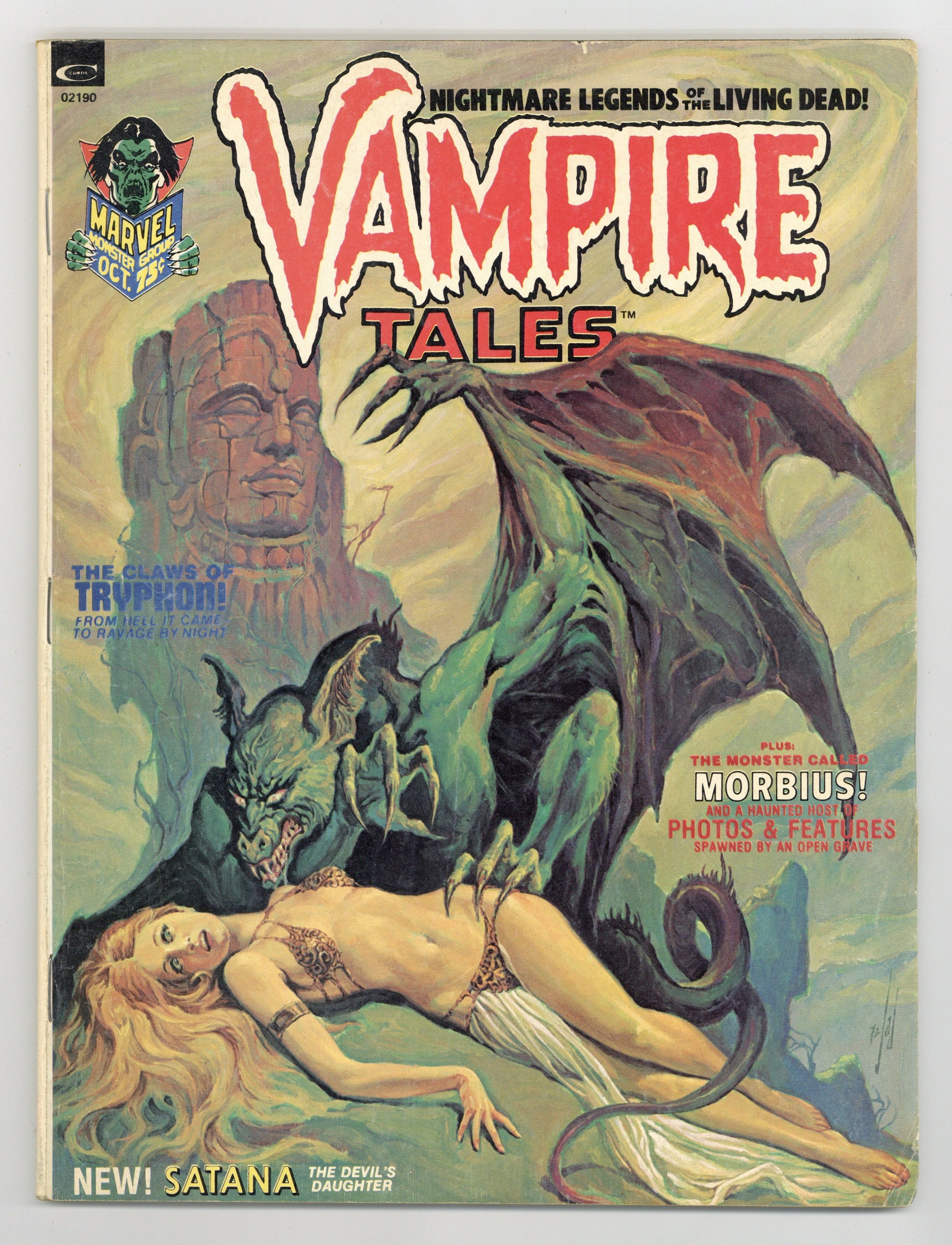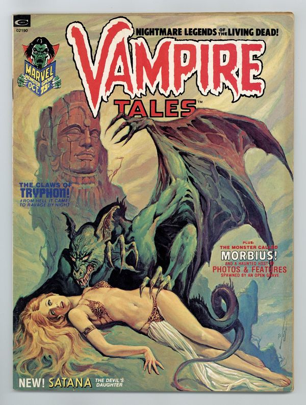 Ends Mar 16 10:02 PM CST Bid History 7 bids Current Bid $42 Your Secret Max Bid If you'd like to bid, please log in or register. Morbius finds himself rescuing a young woman when she's nabbed by a mysterious coven in "The Blood Sacrifice of Amanda Saint" (Story by Don McGregor, art by Rich Buckler and Pablo Marcos). In 1600s Salem, Massachusetts a young woman tries to escape a bloodthirsty mob after she's wrongfully accused of being a witch in "Witch Hunt!" (Story credits: unknown, art by Mannie Banks). An article about Bela Lugosi's other vampire roles aside from Dracula by Doug Moench. An adventurer named Simon Majors enters another dimension that serves a powerful being in "Five Claws to Tryphon" (Story by Gardner Fox, art by Jesus Blasco and John Romita). Article by Chris Claremont. First appearance of Satana, the Devil's Daughter in "Satana" (Produced by Roy Thomas and John Romita). Lou and Marie Fowler search for a secret fortune in a creepy house once owned by Lou's late uncle, but they get more than they bargained for in "At the Stroke of Midnight" (Story and art by Jim Steranko). Hodiah Twist investigates the death of a man who's been killed by vampires in "The Praying Mantis Principle" (Story by Don McGregor, art by Rick Buckler). JAD painted cover. Black and white, 74 pages. 75 cent cover price. Cover price $0.75.