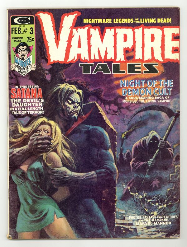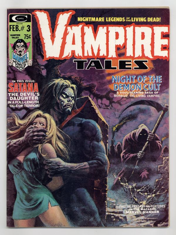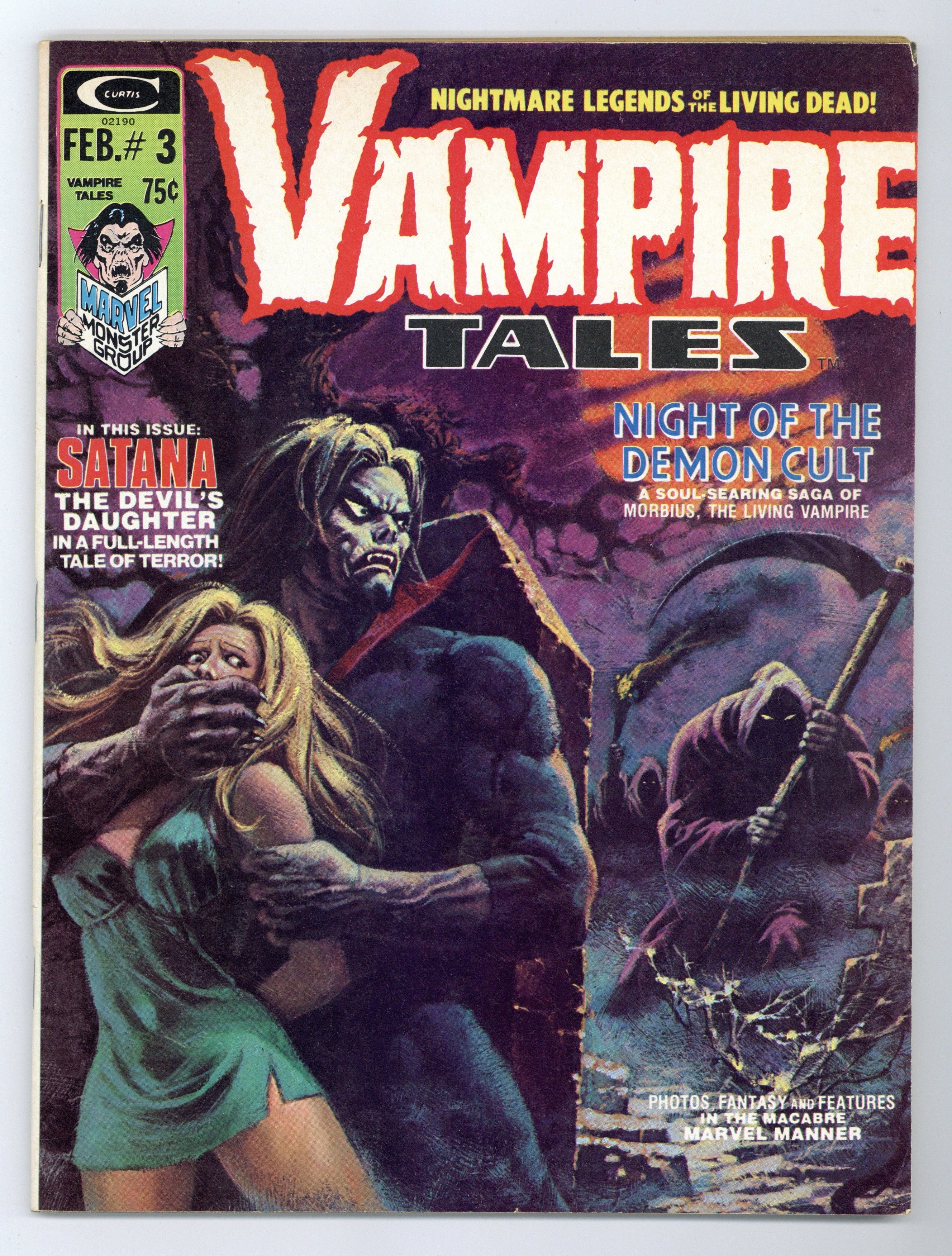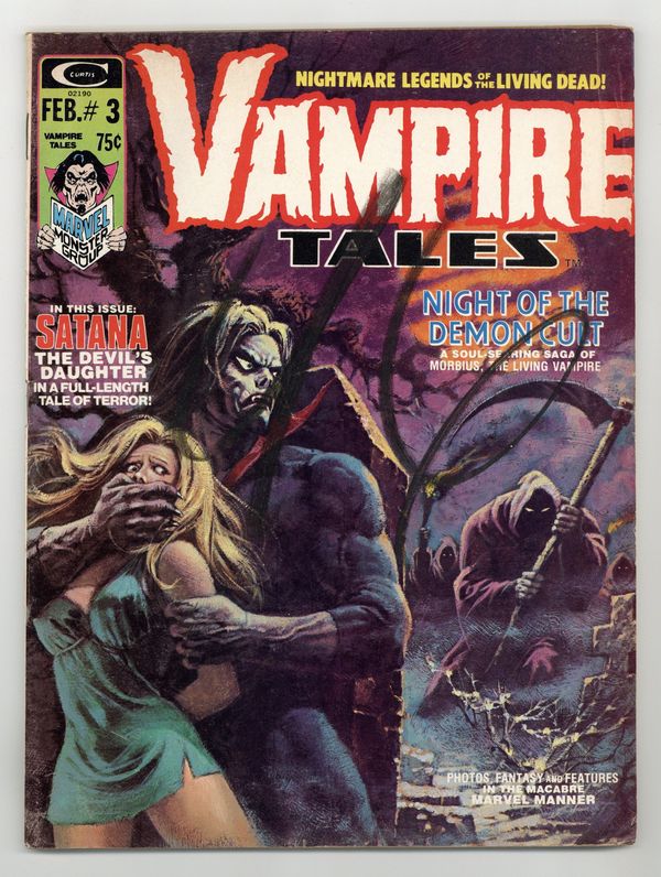 $12.75Painted cover art by Luis Dominguez. "The Kiss of Death," script by Gerry Conway, art by Esteban Maroto; A preacher tries to have Satana killed. "The Collection," script by Bhob Stewart, pencils by Paul Reinman, inks by Russ Jones and Bhob Stewart (backgrounds). "Don't Try To Outsmart the Devil," script by Stan Lee, pencils by Carmine Infantino; An evil man makes a bargain with Satan that his heart will never stop beating so that he will live forever, but Satan merely arranges it so that his heart continues to beat after his body has rotted away. "Bat's Belfry," script by Don McGregor, art by Vicente Alcazar; adapted from August Derleth's first published short story. "Vampires In Time and Space" one-page story, script by Tony Isabella, art by Pablo Marcos. "Demon Fire," script by Don McGregor, pencils by Rich Buckler, inks by Klaus Janson; story about a demonic cult. 68 pgs., B&W. Cover price $0.75.