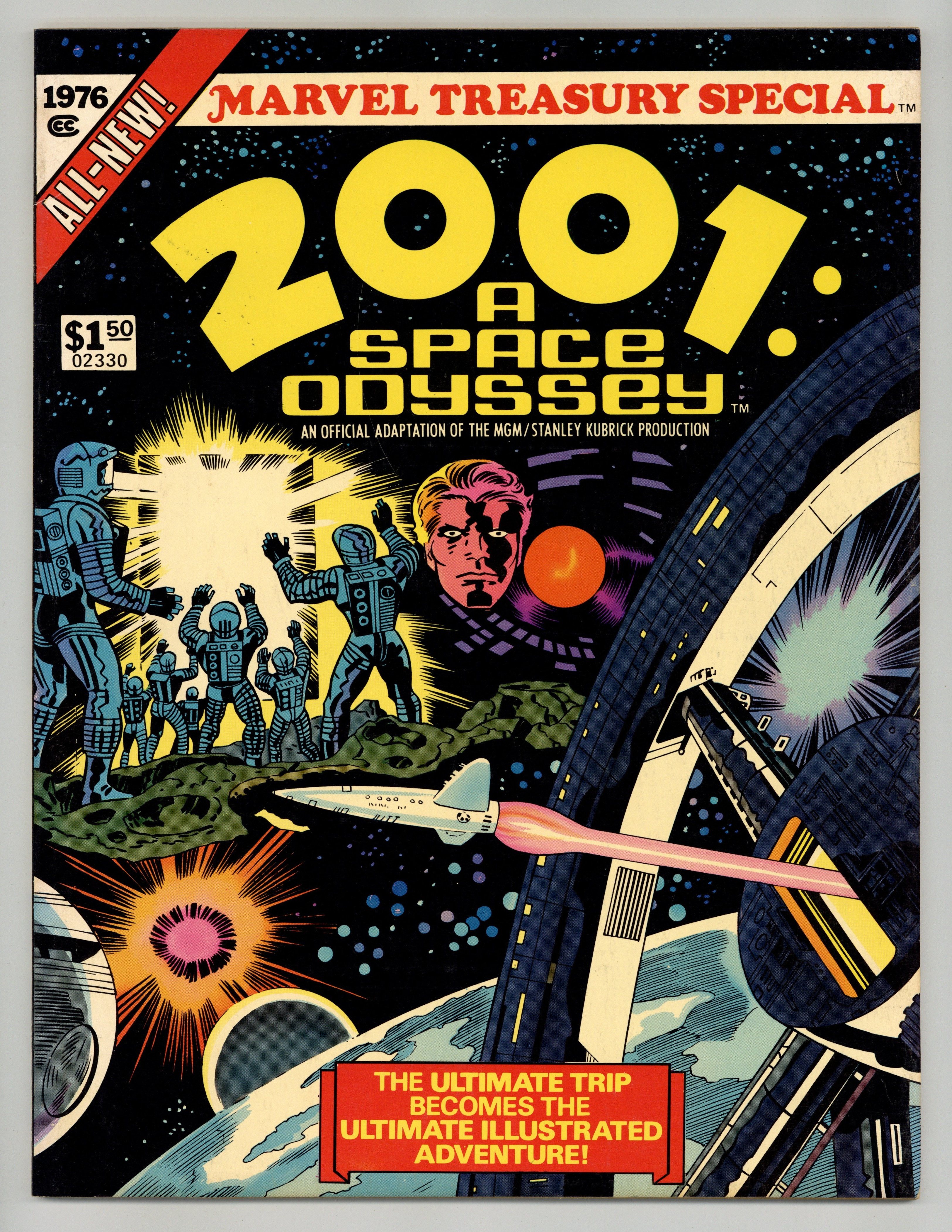 2001: A Space Odyssey Treasury (1976) is an official adaptation of the movie directed by critically acclaimed Stanley Kubrick. Adapted by legendary writer/artist Jack Kirby with inks by Frank Giacoia. Also included is a 2001: A Space Odyssey retrospective and photos by Dave Kraft from the movie. 82 pages. Cover price $1.50.