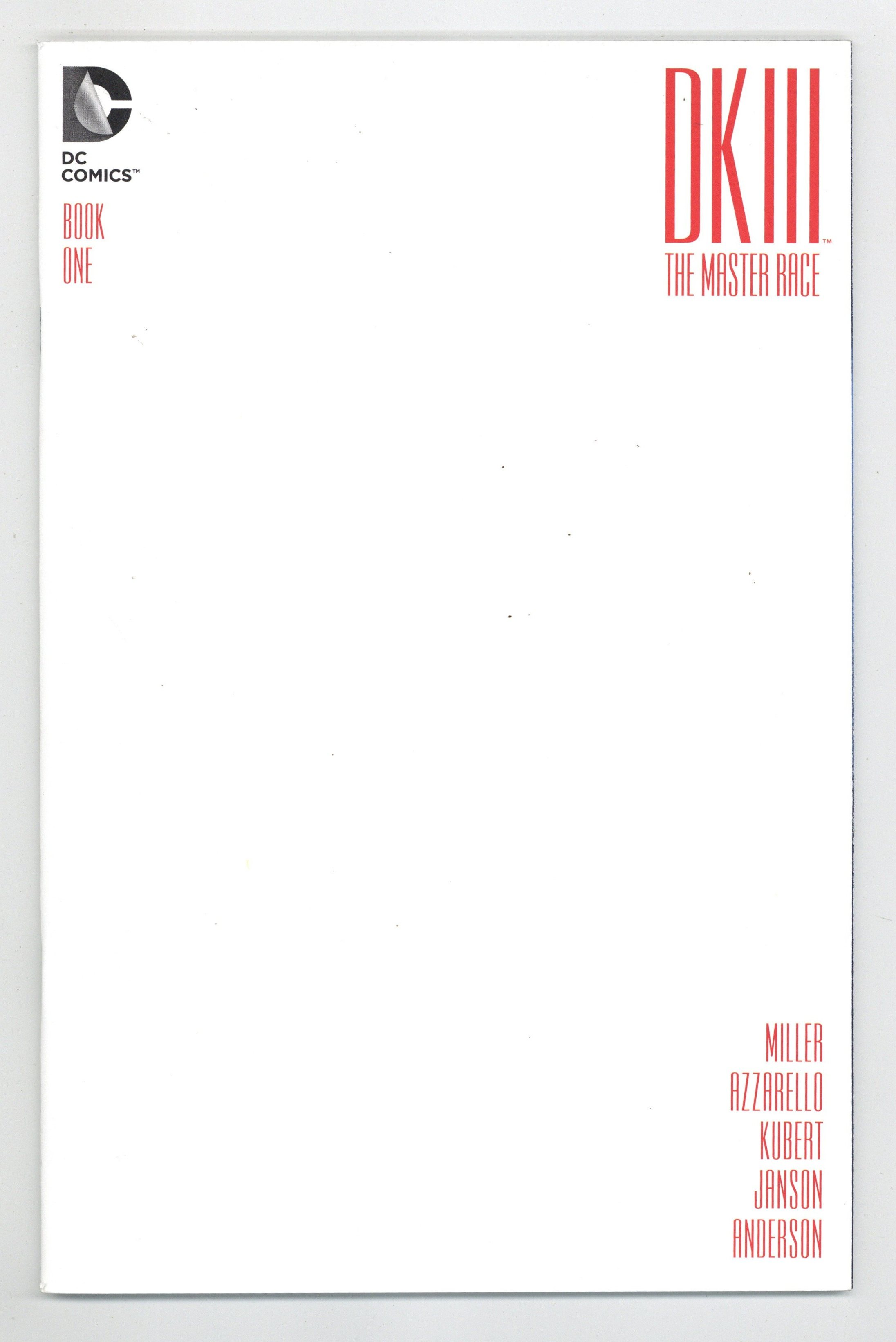 Tags: Batman$8.00Convention Exclusive Blank Cover. Written by Frank Miller and Brian Azzarello. Art by Andy Kubert and Klaus Janson. The epic ending you never saw coming is here because you demanded it! The Dark Knight rises again to face the dawn of the master race! 36 pages, full color. Includes a bound-in, 12 page mini-comic (5 1/2-in X 8 1/2-in): Dark Knight Universe Presents: Atom. #1